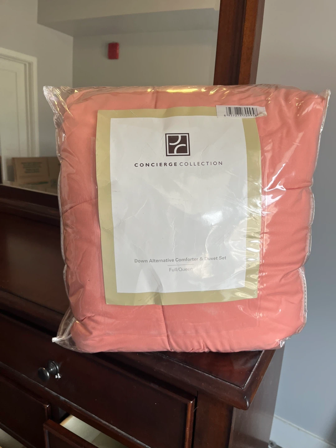 This is a Concierge Collection Down Alternative Comforter & Duvet Set. It's a full/queen size set. The comforter has a floral pattern on one side and is solid coral on the other. Two comforters.