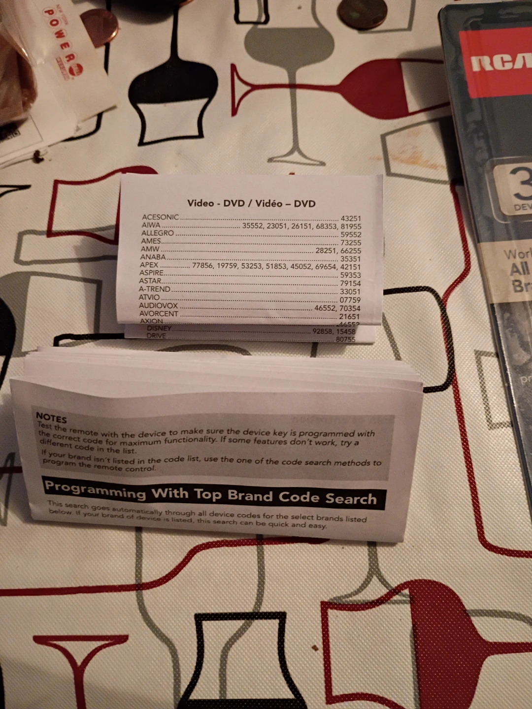This is an RCA universal remote control for SAT/CBL, DVD, Blu-Ray, and TV devices. It's designed for easy programming with top brand code search. Includes a code list for various brands and programming notes.
