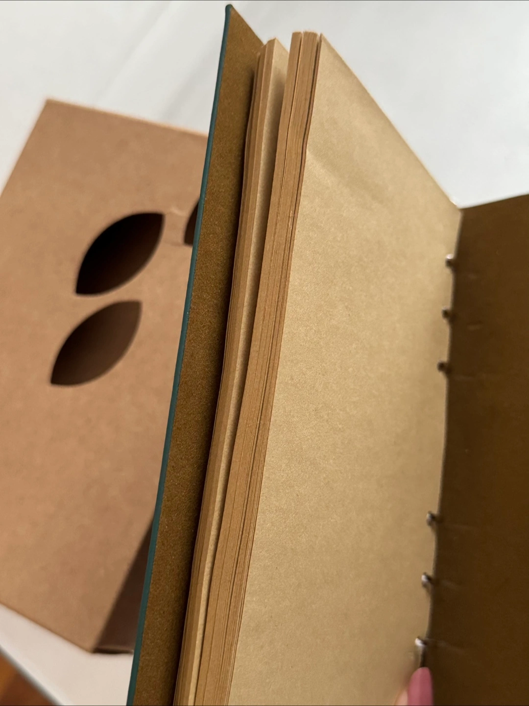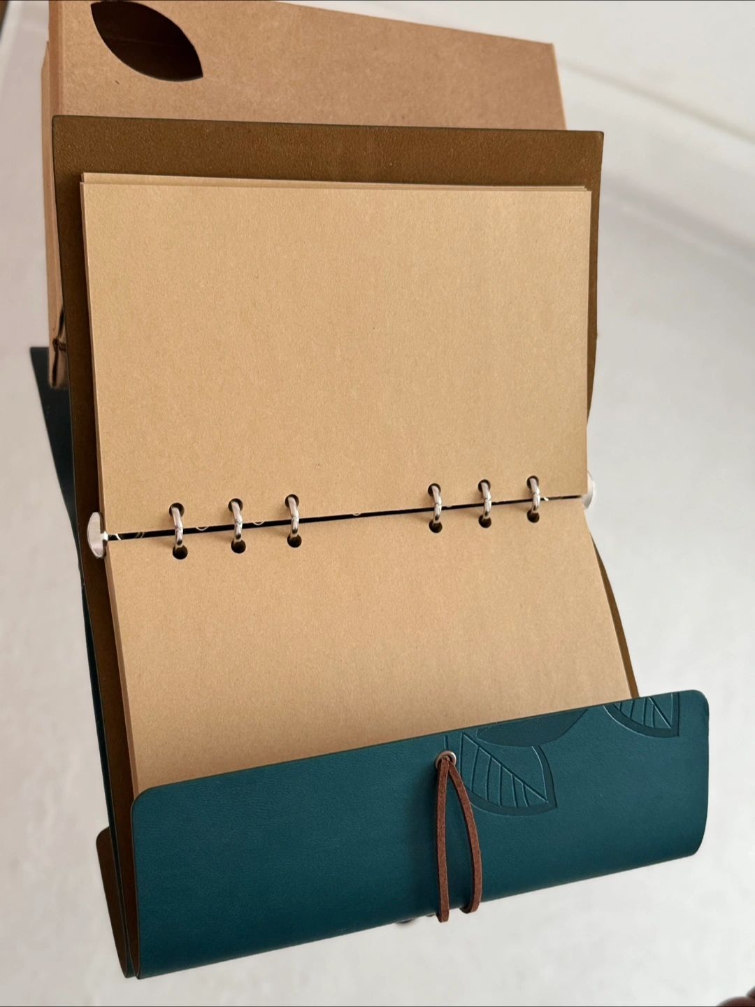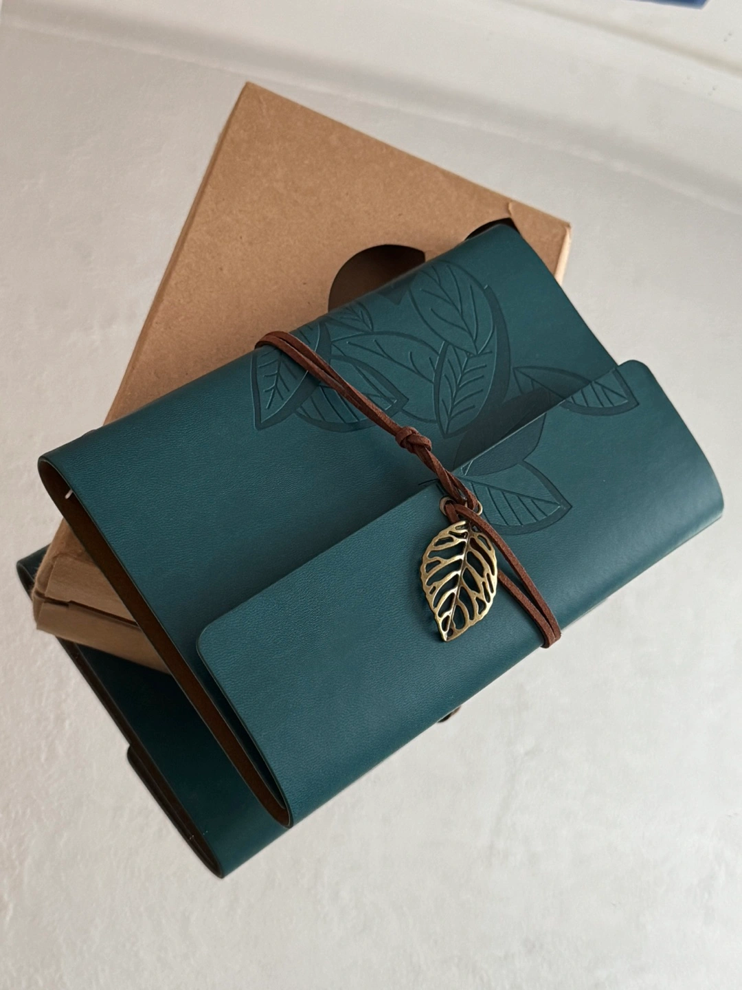 I'm selling a beautiful teal leather journal. It has a leaf design embossed on the cover and a cute leaf charm attached with a brown leather cord. It comes with its original box, making it perfect for gifting or personal use. The journal features refillable pages held together with a ring binder. It's in great condition and ready for your thoughts, notes, or sketches