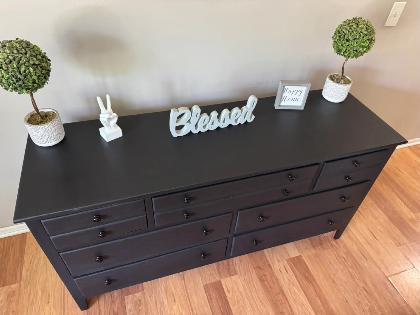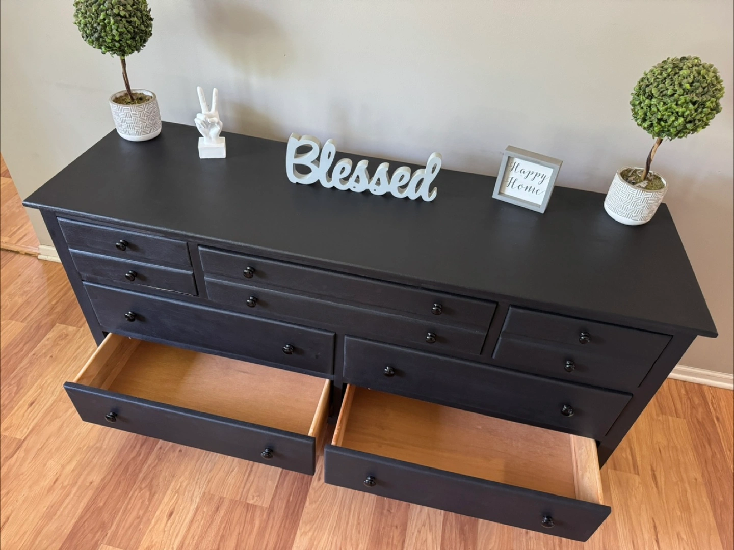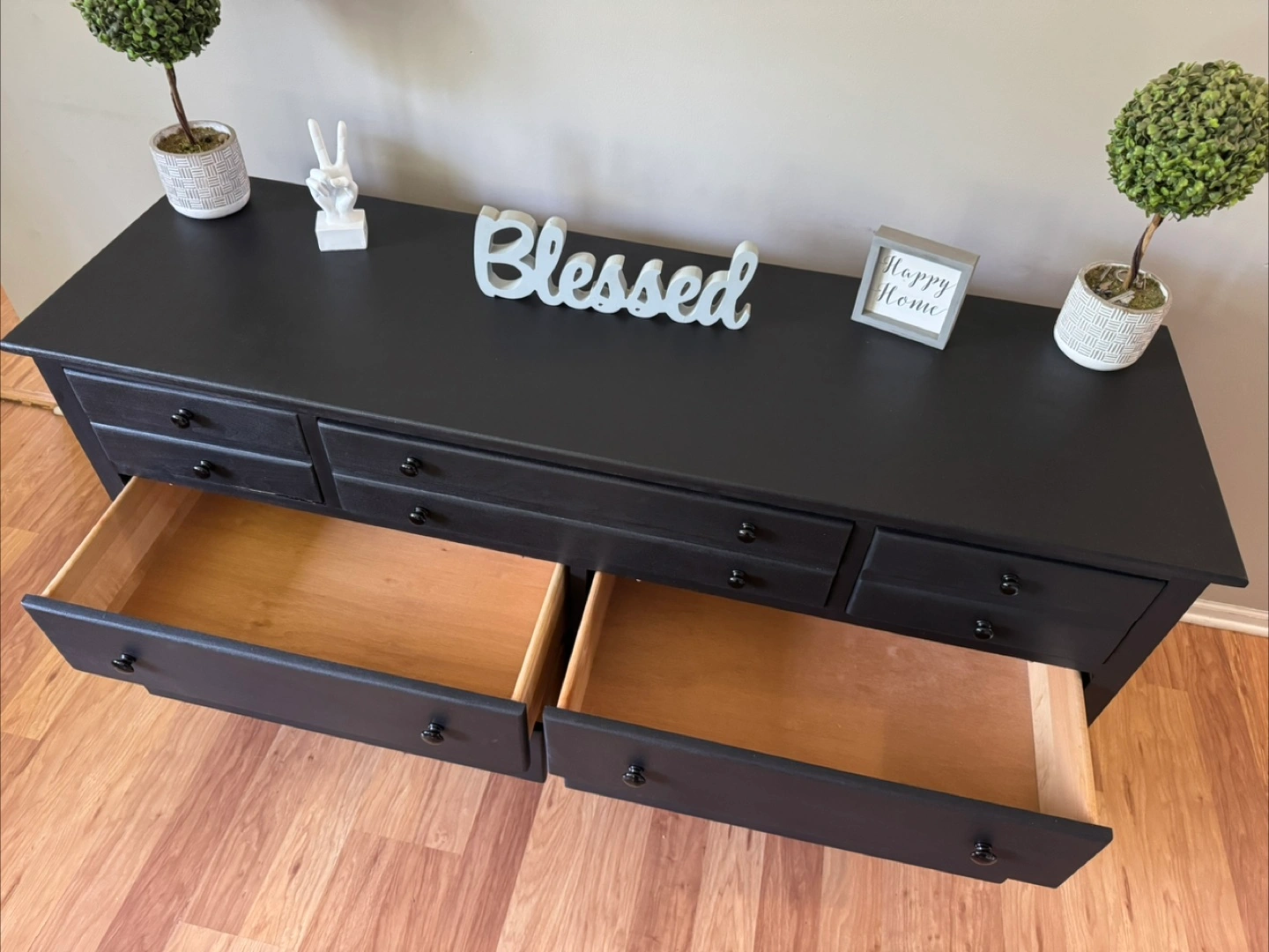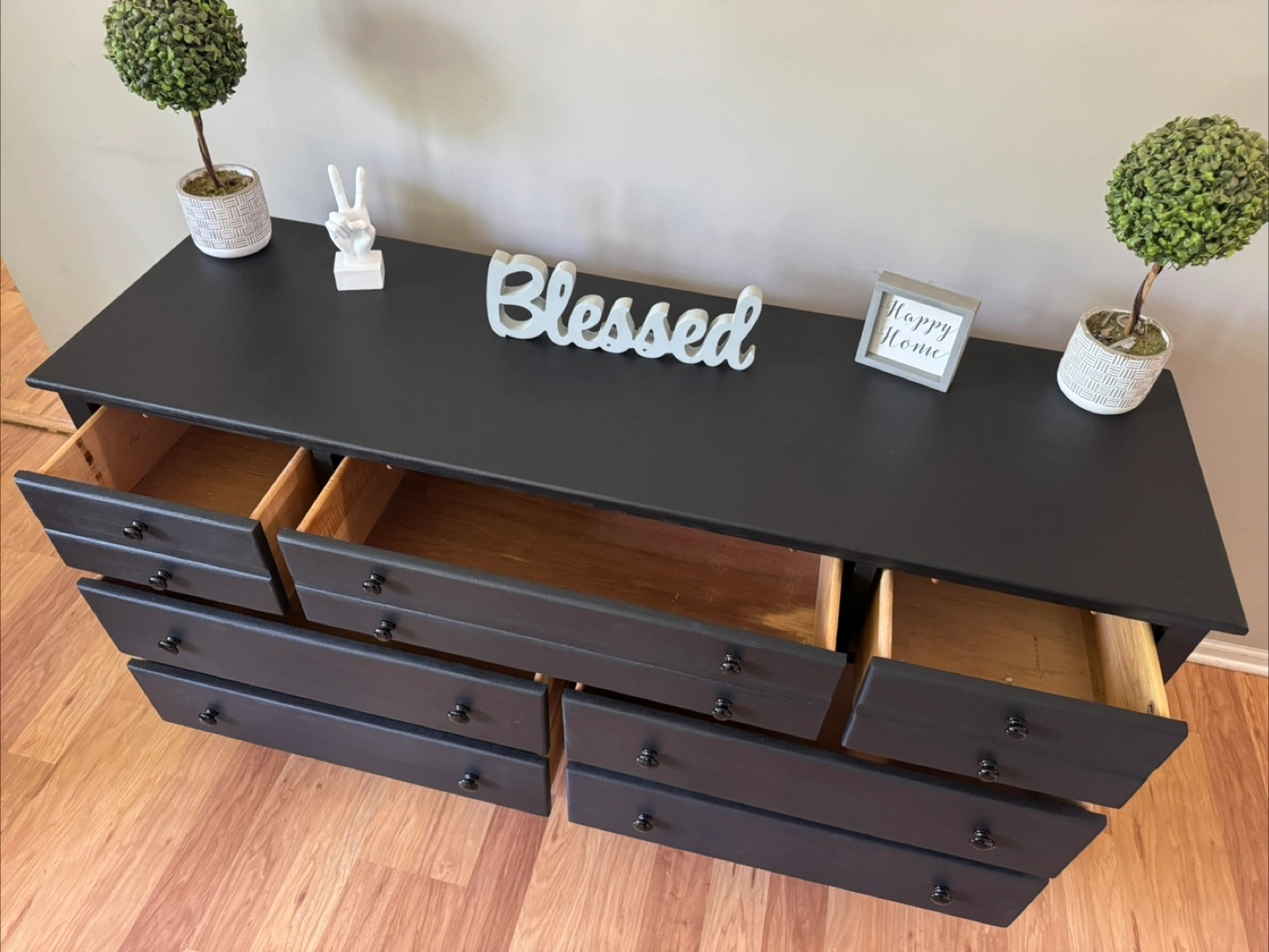 137✨Gorgeous black solid wood/refinished dresser, Solid furniture💪🏼, black hardware,all 7 drawers pull out fine on tracks, solid piece💪🏼, Clean & sturdy! This is NOT that cheap wayfair/Ikea furniture, this will last you FOREVERR, I sell good quality furniture & my prices are still better/cheaper than a furniture store. Please don’t ask to lower my price‼️ A LOT OF REQUEST ON BLACK, SO HERE IT IS, GET IT WHILE ITS HOT 🔥 🤗 Measurements; 32 inches tall 62 inches wide 19 inches deep FAST & EASY DRIVEWAY PICKUP IN LOCKPORT✅ BRING HELP IF YOU HAVE IT💪🏼OR WE CAN ASSIST HELP AFTER 4P.M MON-FRI‼️DELIVERY AVAILABLE🚚, $50 DEPOSIT REQUIRED! CASH ONLY‼️ BRING EXACT CHANGE PLEASE‼️$50 DEPOSIT WITH ZELLE & ITS COMPLETELY YOURS‼️ (DECOR NOT INCLUDED)‼️ CHECKOUT MY OTHER LISTINGS 😁 ✨Feel free to follow me for more upcoming furniture & I definitely appreciate you for following me! 🤝✨