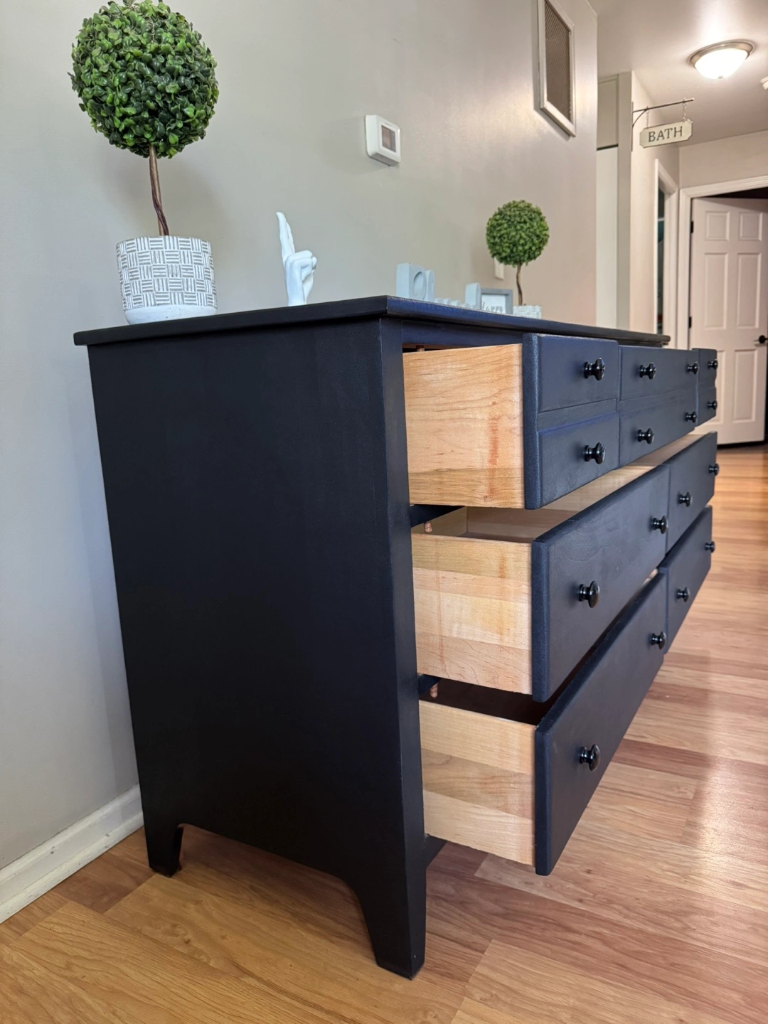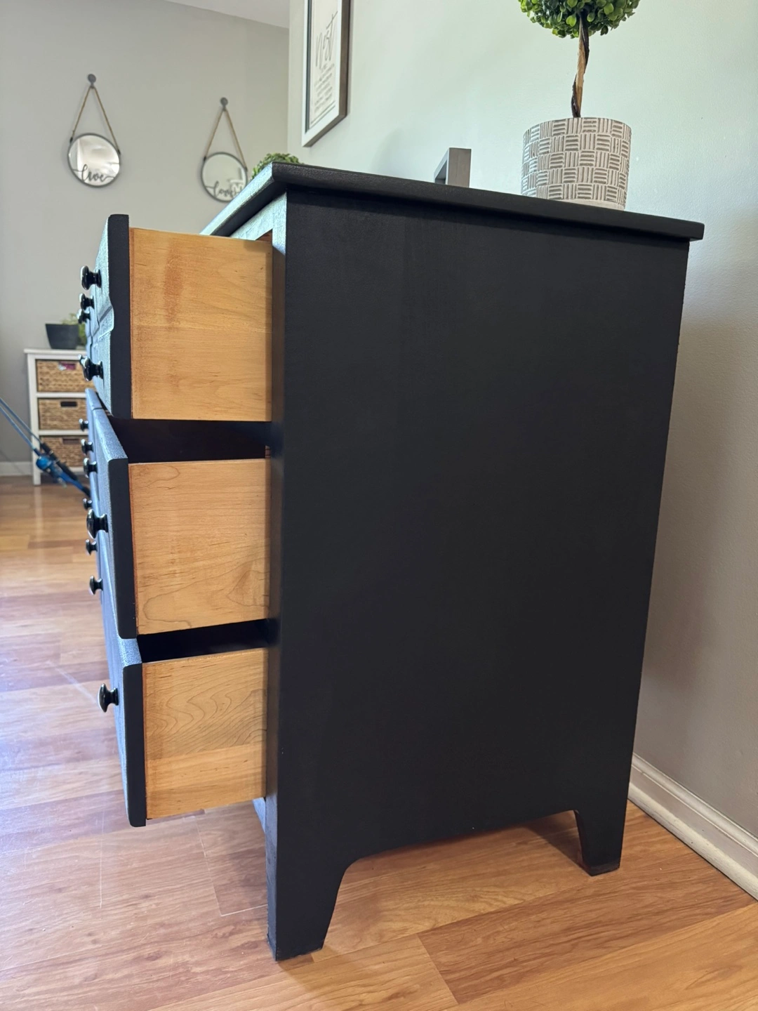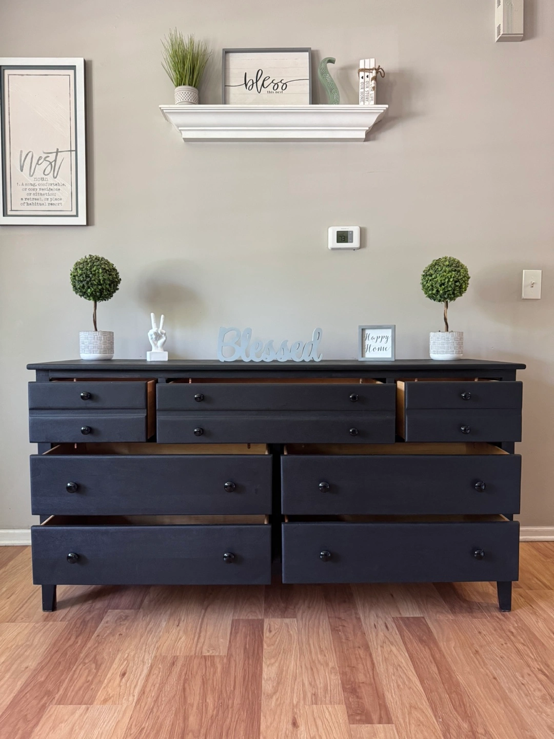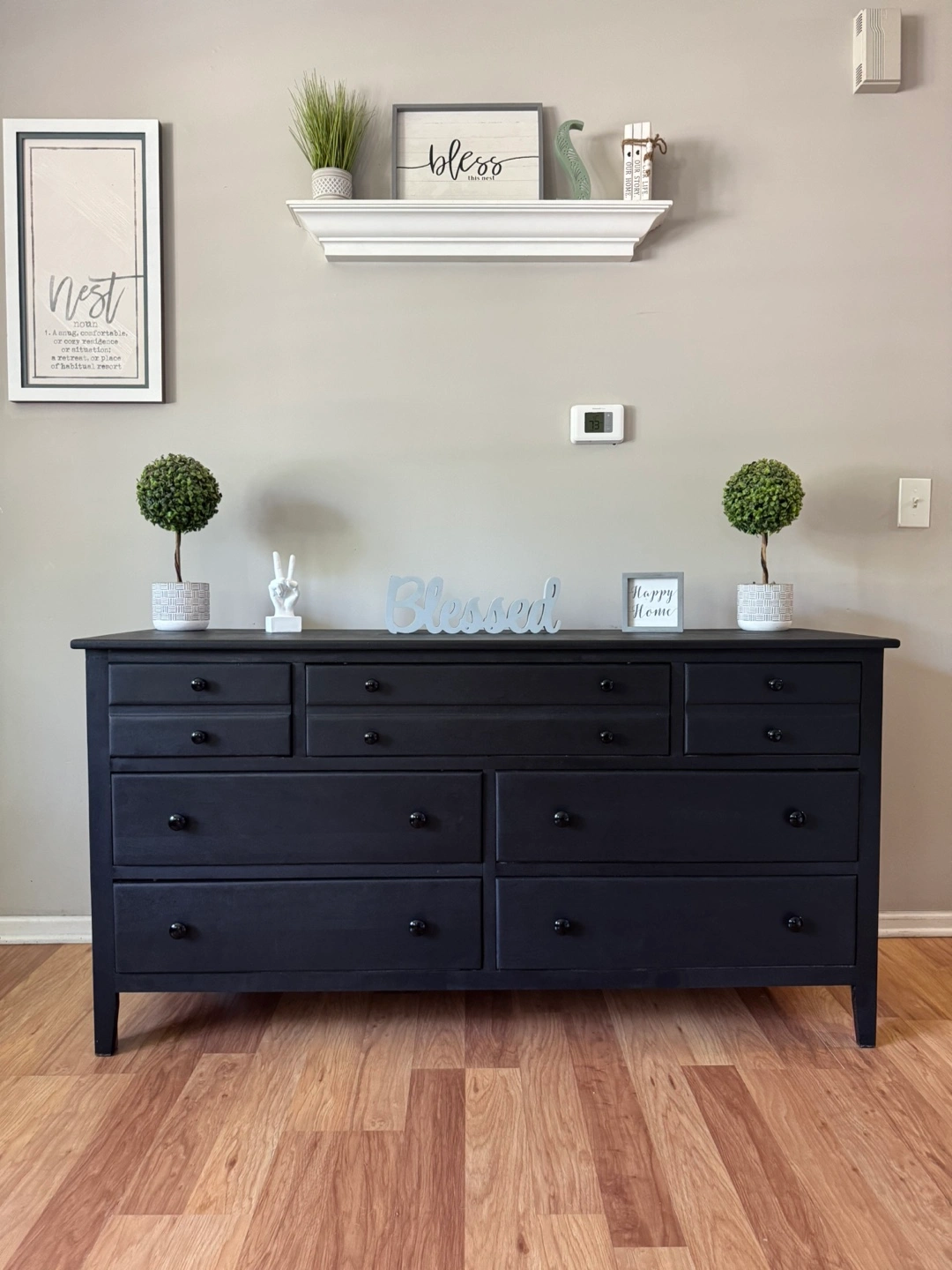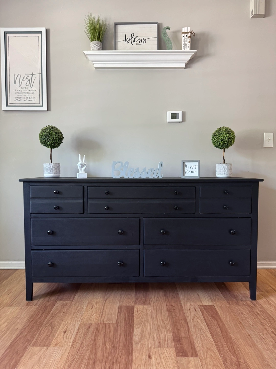 137✨Gorgeous black solid wood/refinished dresser, Solid furniture💪🏼, black hardware,all 7 drawers pull out fine on tracks, solid piece💪🏼, Clean & sturdy! This is NOT that cheap wayfair/Ikea furniture, this will last you FOREVERR, I sell good quality furniture & my prices are still better/cheaper than a furniture store. Please don’t ask to lower my price‼️ A LOT OF REQUEST ON BLACK, SO HERE IT IS, GET IT WHILE ITS HOT 🔥 🤗 Measurements; 32 inches tall 62 inches wide 19 inches deep FAST & EASY DRIVEWAY PICKUP IN LOCKPORT✅ BRING HELP IF YOU HAVE IT💪🏼OR WE CAN ASSIST HELP AFTER 4P.M MON-FRI‼️DELIVERY AVAILABLE🚚, $50 DEPOSIT REQUIRED! CASH ONLY‼️ BRING EXACT CHANGE PLEASE‼️$50 DEPOSIT WITH ZELLE & ITS COMPLETELY YOURS‼️ (DECOR NOT INCLUDED)‼️ CHECKOUT MY OTHER LISTINGS 😁 ✨Feel free to follow me for more upcoming furniture & I definitely appreciate you for following me! 🤝✨