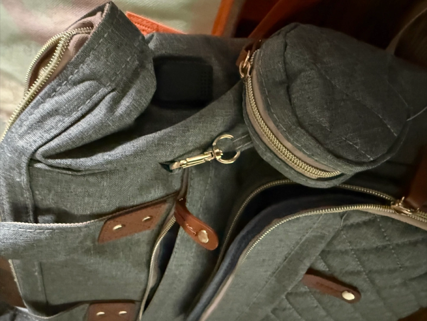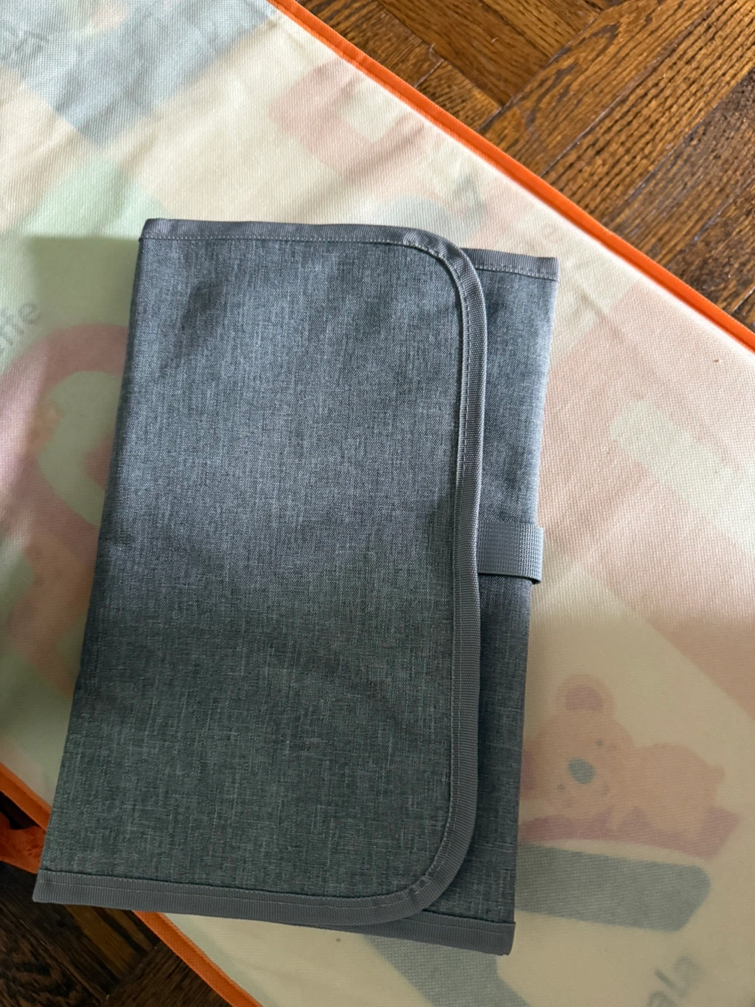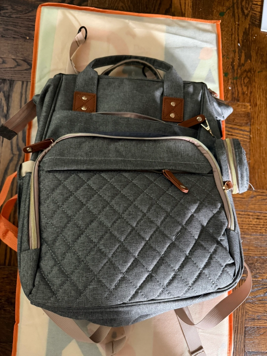 This is a grey diaper bag backpack. It has multiple compartments and zippers for easy organization. The bag has adjustable straps for comfortable carrying. It also includes a changing pad.