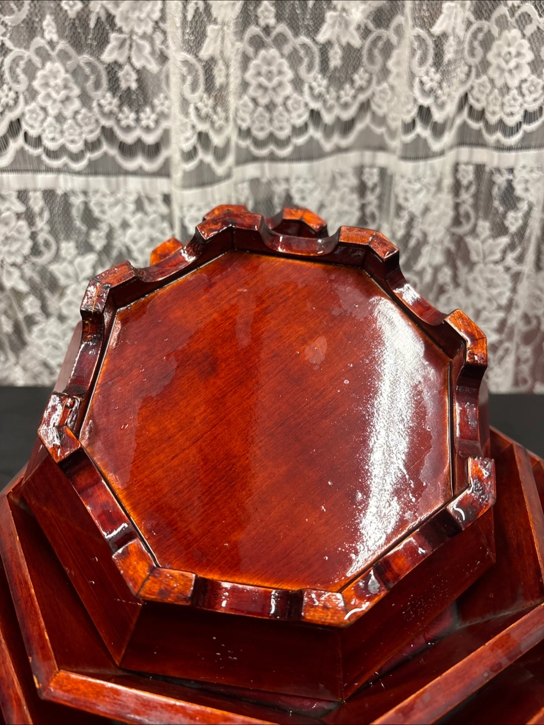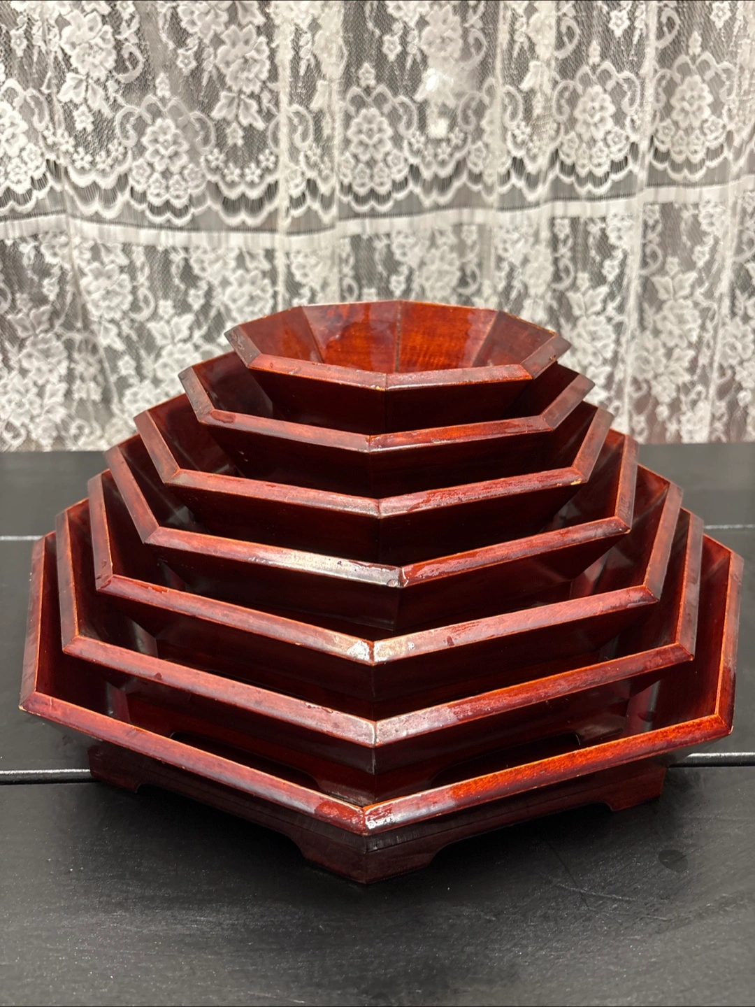 I'm selling a BAGU 3 SPANIA wooden tiered serving dish. It's a beautiful piece for displaying and serving food or as a decorative item in your home. The dish has a rich, warm color and a unique tiered design that adds a touch of elegance to any setting