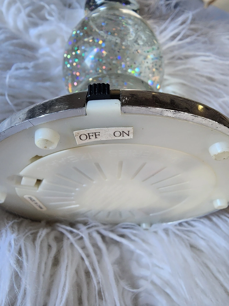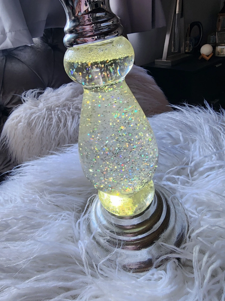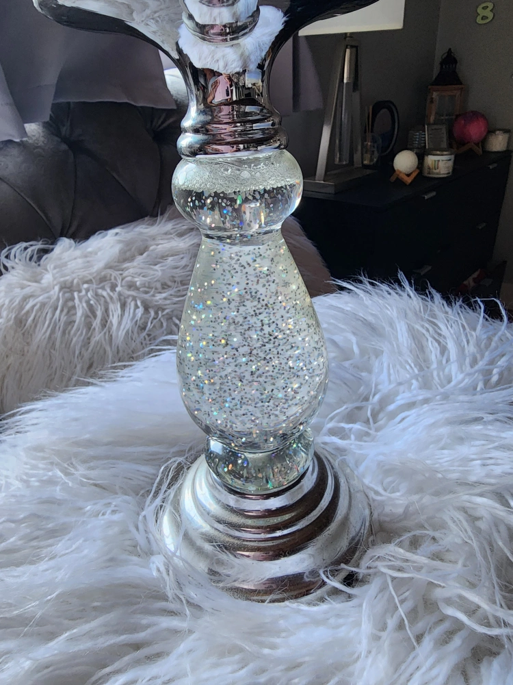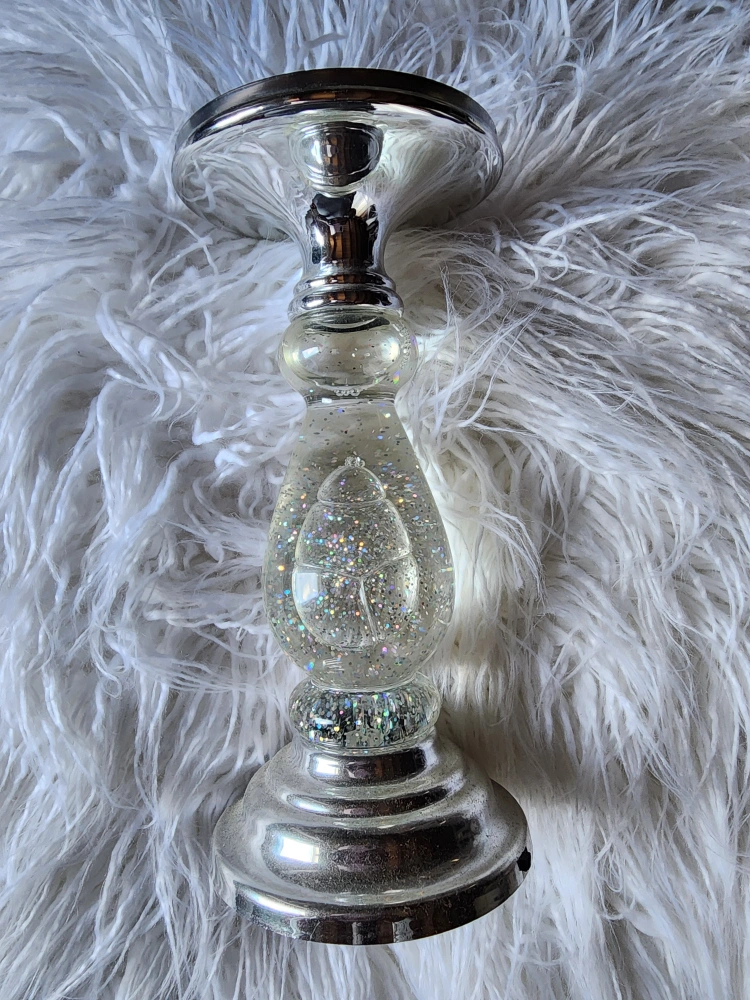This is a really cute candle holder filled with liquid and glitter! It's in great condition and would look great in any room. Turn it on, light it up, and watch the glitter sparkle.