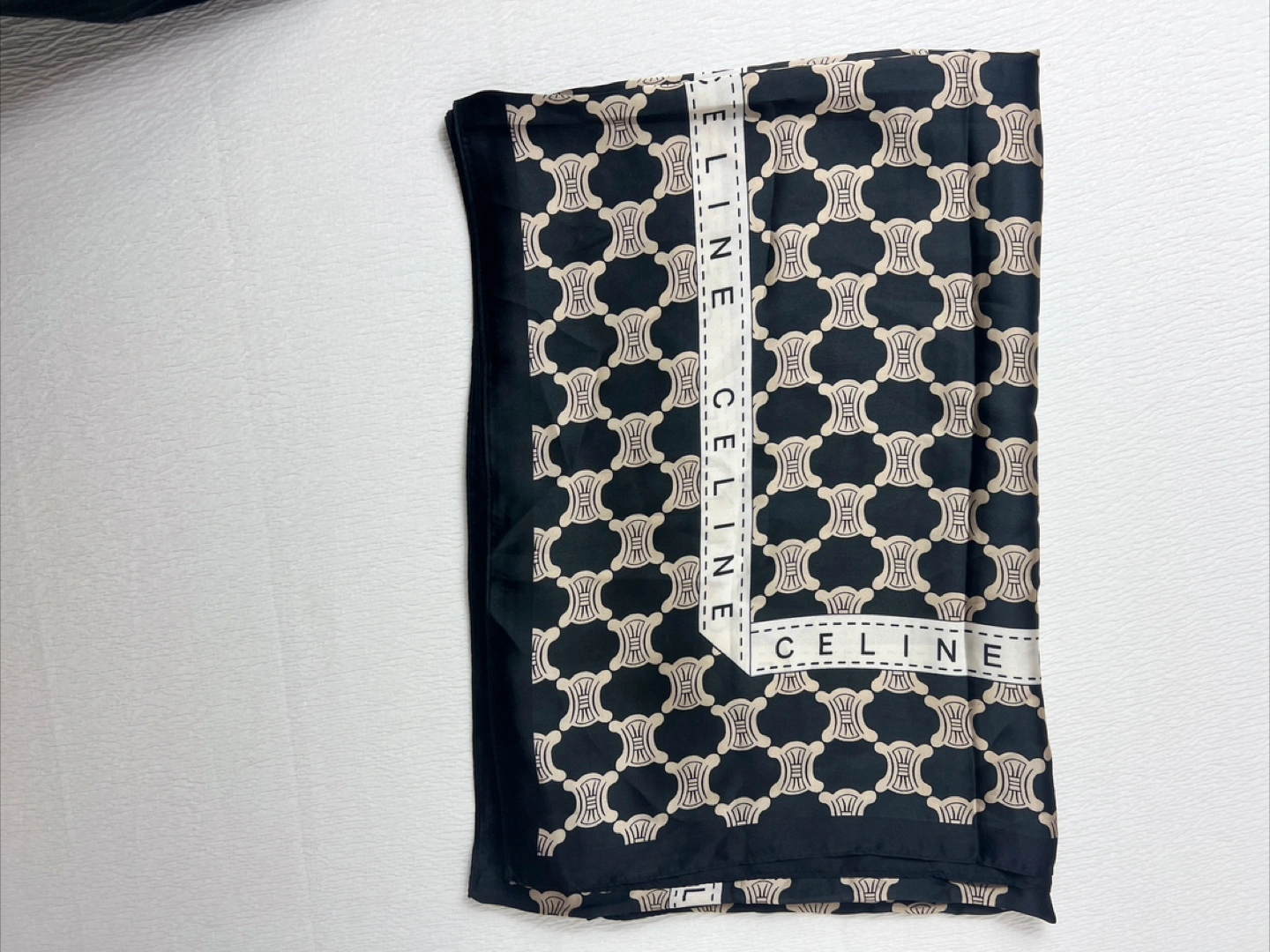 105Selling a Celine silk scarf in black. It has a repeating pattern of the Celine logo. The scarf is made of silk!