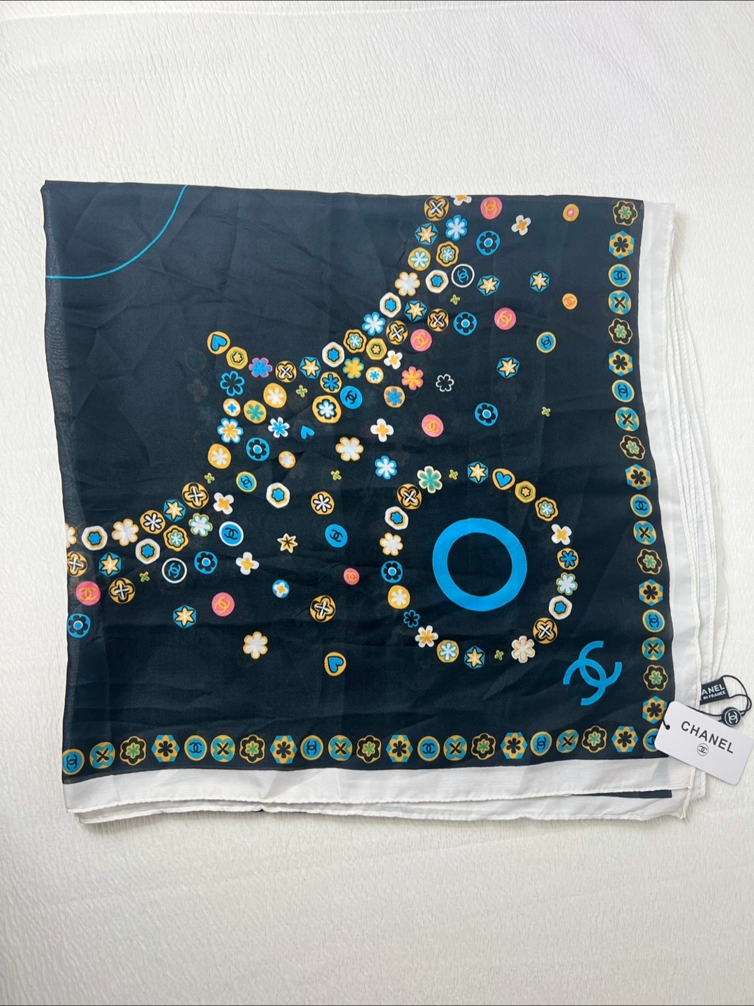 This is a beautiful Chanel scarf. It is black silk with a colorful design. The scarf has a tag. Perfect for adding a touch of luxury to any outfit!