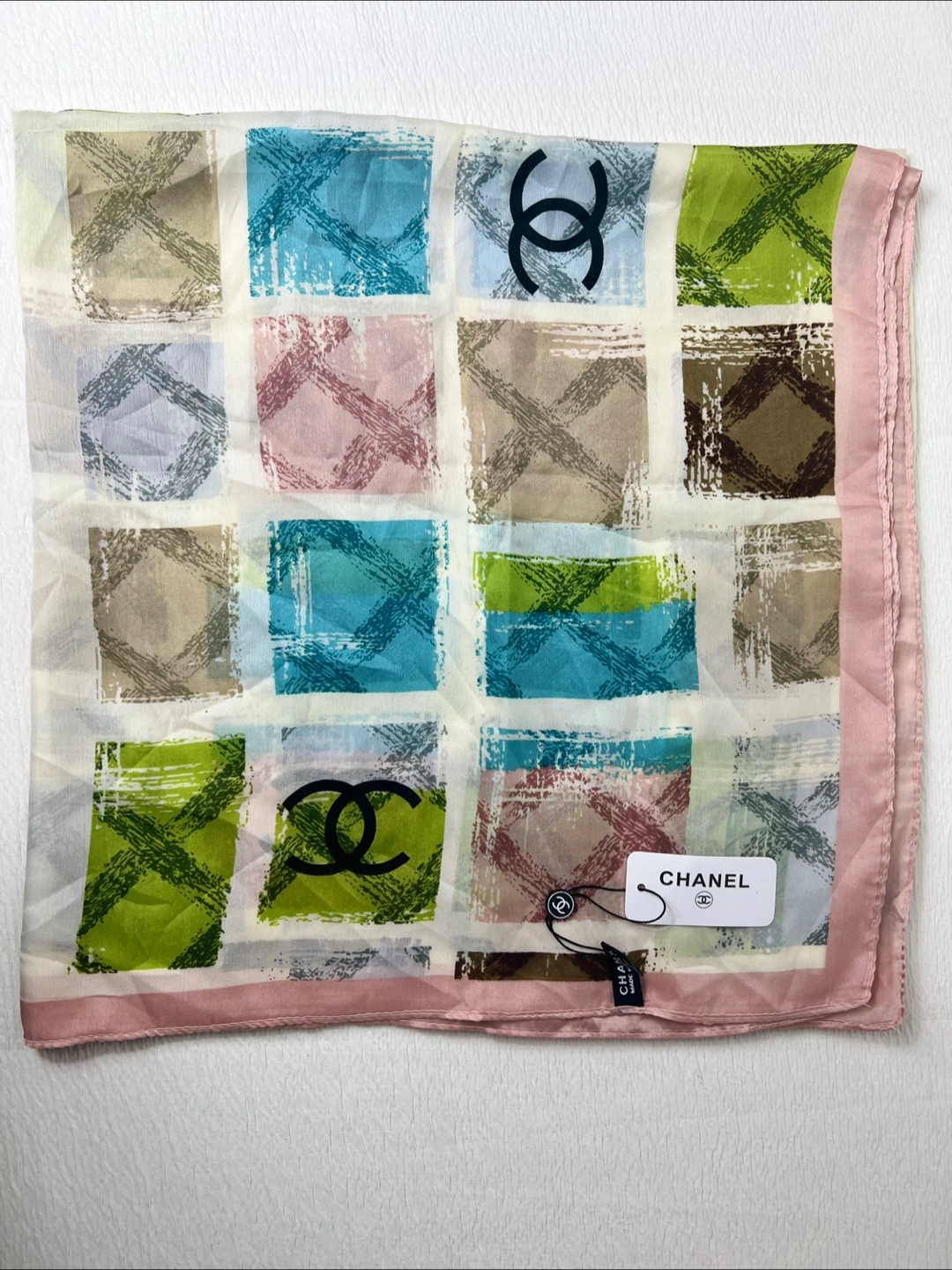 Selling a beautiful Chanel silk scarf. The scarf features a colorful square pattern with the iconic Chanel logo. The edges are finished with a delicate pink border. It's in great condition and ready to add a touch of luxury to your wardrobe!