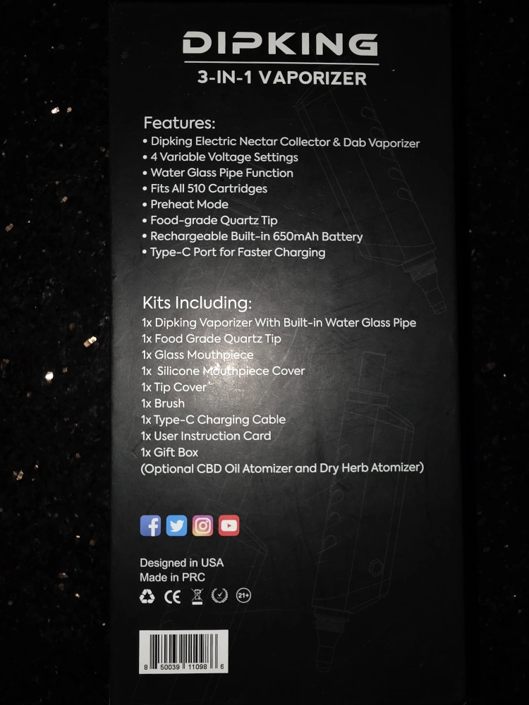 Selling a Dipking 3-in-1 Vaporizer! It features Dipking Electric Nectar Collector & Dab Vaporizer, 4 Variable Voltage Settings, and Water Glass Pipe Function. It also fits ALL 510 Cartridges and has a Preheat Mode. The vaporizer comes with a food-grade quartz tip and a rechargeable built-in 650mAh battery with a type-C port for faster charging. The kit includes: - Dipking Vaporizer with Built-in Water Glass Pipe - Food Grade Quartz Tip - Glass Mouthpiece - Silicone Mouthpiece Cover - Tip Cover - Brush - Type-C Charging Cable - User Instruction Card - Gift Box