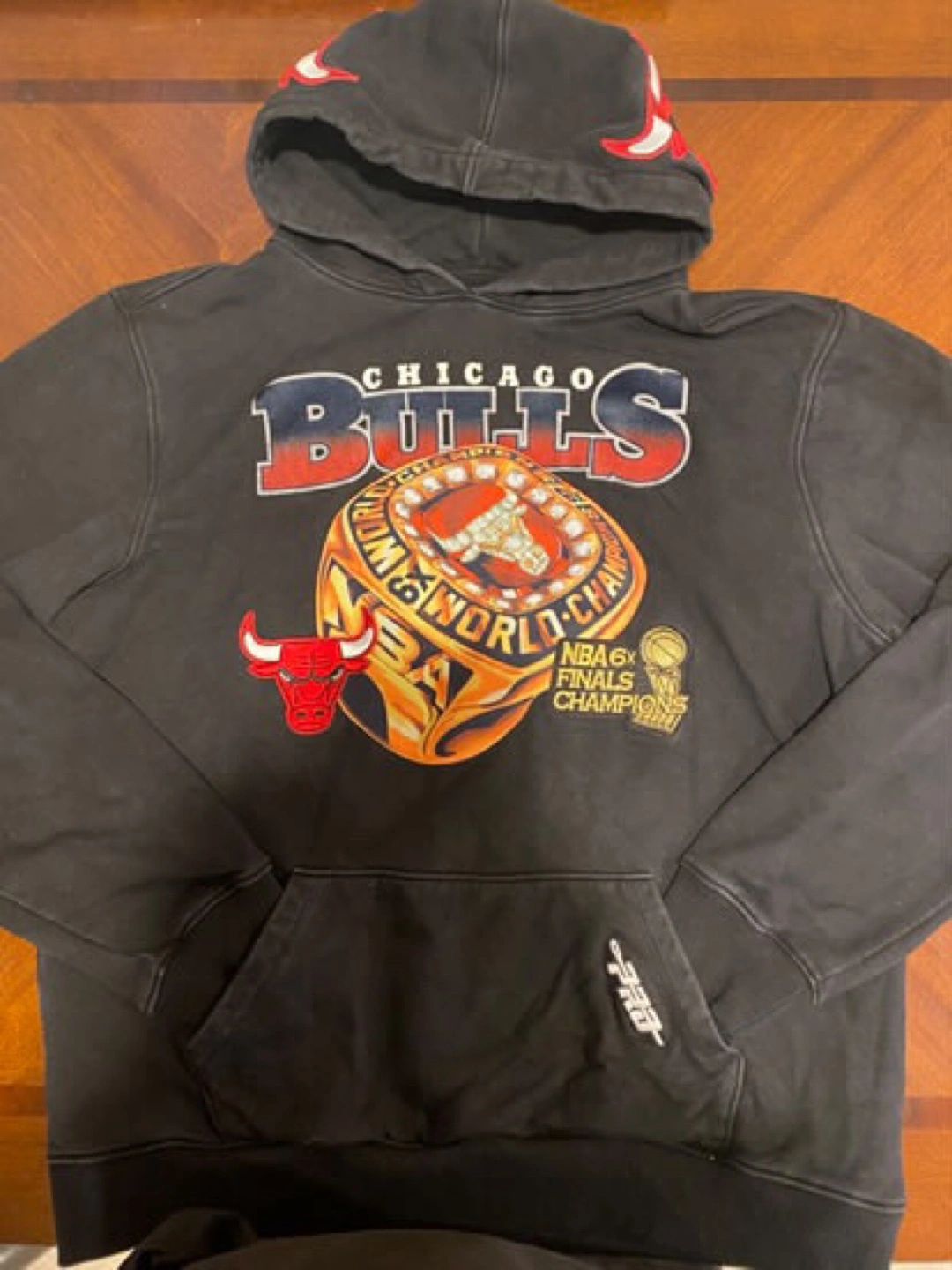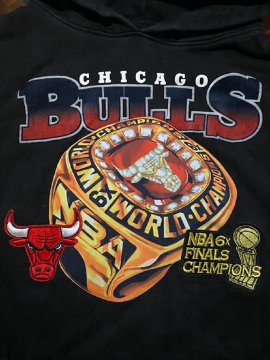Selling a Chicago Bulls hoodie with the NBA 6x Finals Champions design! It features the iconic Bulls logo and a cool graphic. Perfect for any Bulls fan!