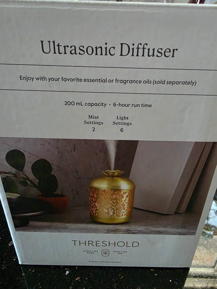 Selling a Threshold ultrasonic diffuser in gold! It has a 200 mL capacity and a 6-hour run time. There are 2 mist settings and 6 light settings. Enjoy your favorite essential or fragrance oils (sold separately). Comes with the box