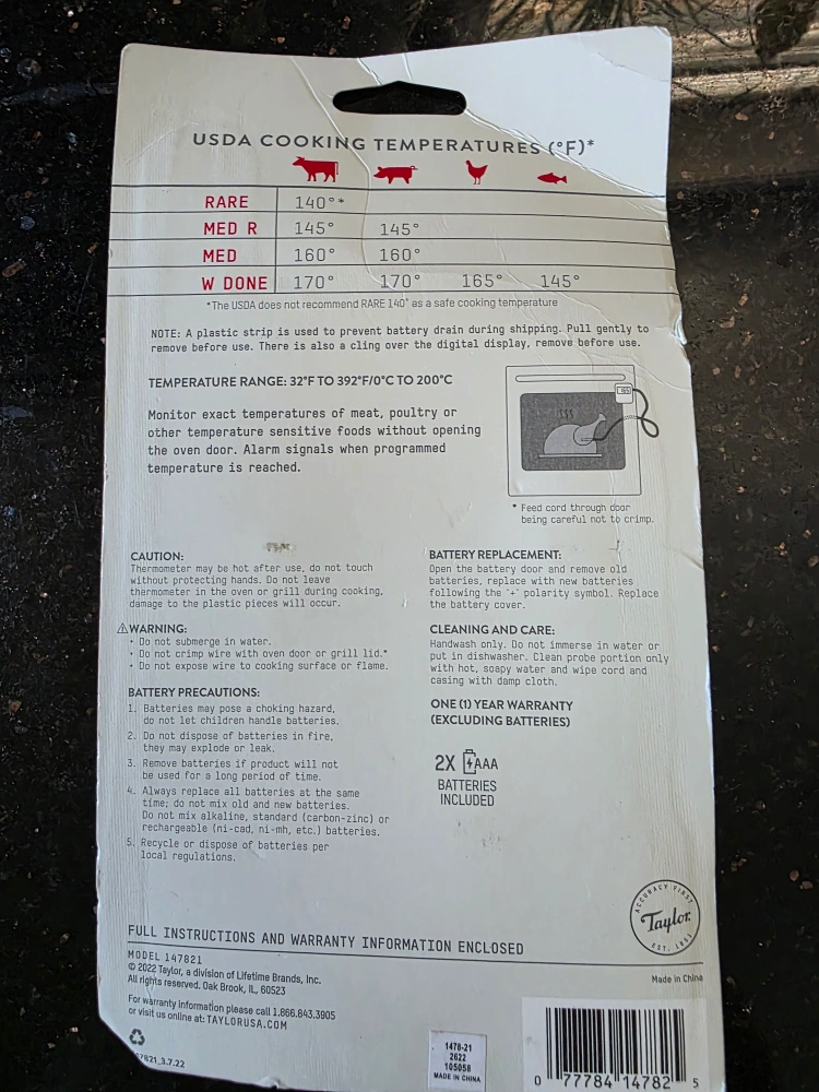 I'm selling a brand new Taylor Stainless Steel Probe Thermometer! It features a digital display and is programmable. It can monitor exact temperatures of meat, poultry, or other temperature-sensitive foods without opening the oven. The oven does alarm signals when programmed. Full instructions and warranty information enclosed are included.