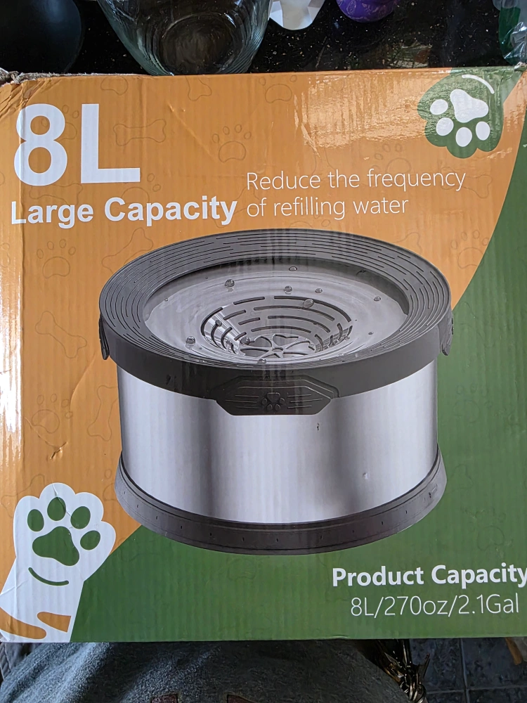 This is an 8L large capacity dog water bowl! It helps reduce the frequency of refilling water. It's a slow drinking dog water bowl, which helps develop a healthy drinking habit for your pet. It's non-spillable and keeps the water clean, which helps with slow drinking and a not wet mouth. The product capacity is 8L/270oz/2.1Gal. The material is stainless steel + PP + Silicone. Product size is 11.46 x 11.46 x 6.81 in