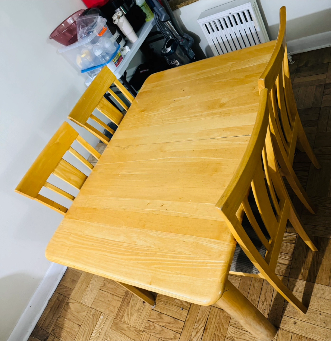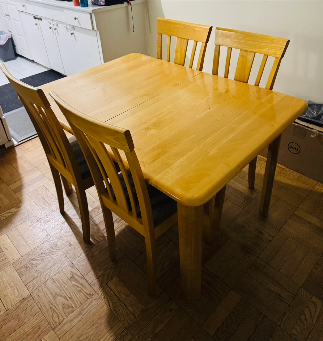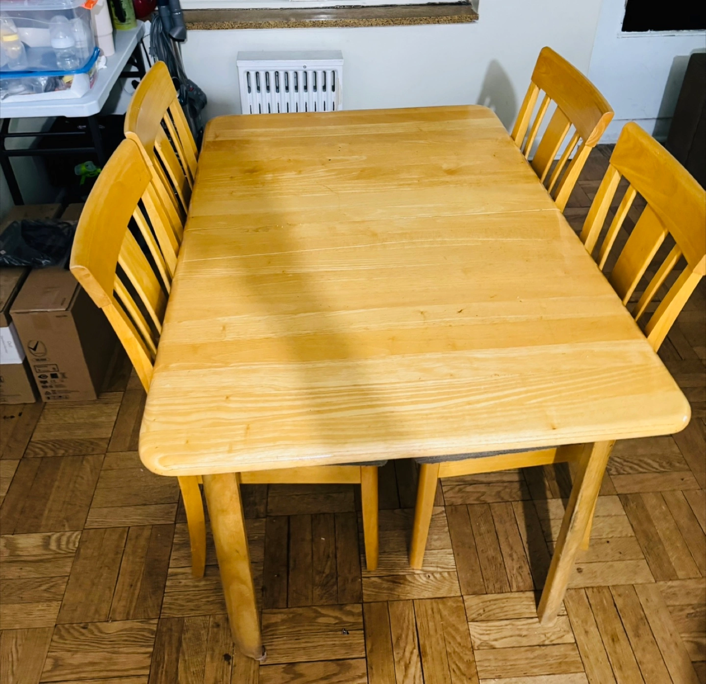 Selling a wooden dining table with four matching chairs. The set is in good condition and perfect for a small family or apartment. The light wood finish gives it a warm and inviting feel. A great addition to any dining space!