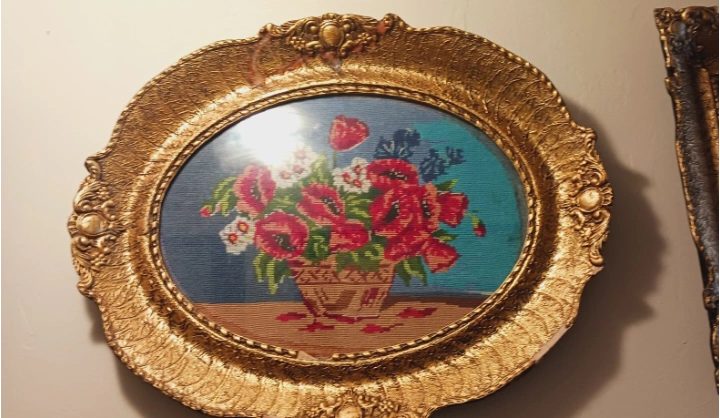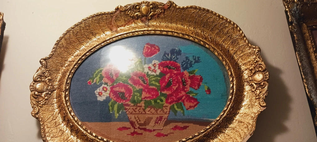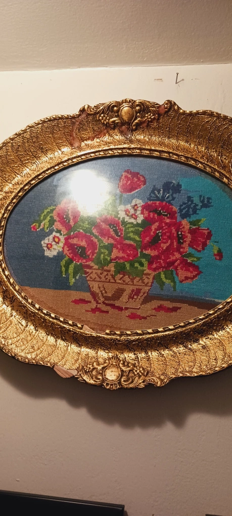 1000+Absolutely Gorgeous Authentic German Wiehler Handcrafted Needlepoint Beautifully Framed Artwork Depicting Wildflowers Poppies. Beautiful vintage floral needlepoint art piece framed in an ornate gold frame. It's a lovely addition to any room and adds a touch of classic elegance. The frame has a little chip at the bottom. 20"×16". ALL MY PRICES ARE NEGOTIABLE !!