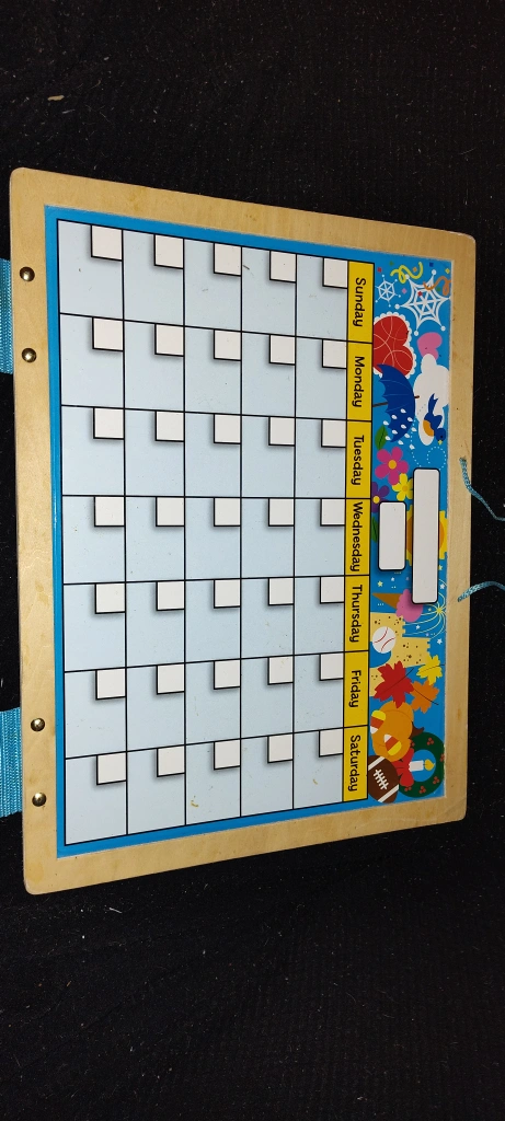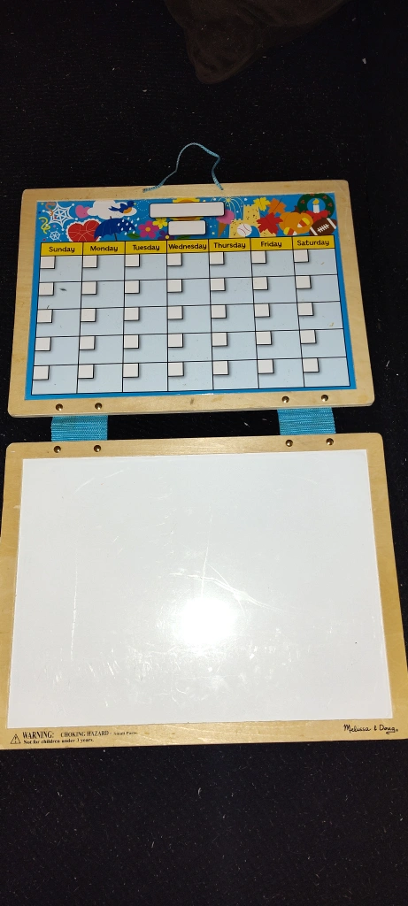 135I'm selling a Melissa & Doug magnetic calendar and whiteboard combo! It's great for teaching kids about days of the week and planning out their schedule. The whiteboard is perfect for drawing and writing notes
