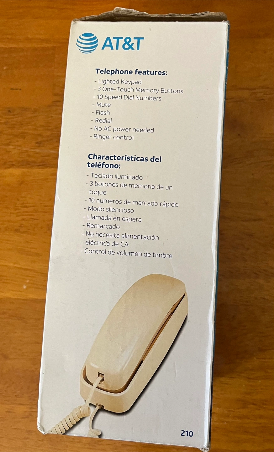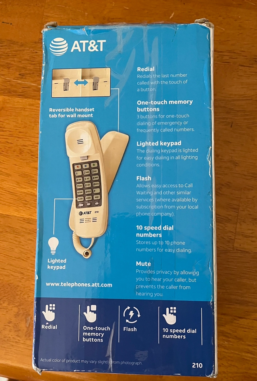 Selling a classic AT&T 210 corded telephone in beige! This phone has some great features: - works when power goes out - Lighted keypad - One-touch memory buttons - 10 speed dial numbers - Mute, flash, and redial options - No AC power needed - Ringer control It also has a reversible handset tab for wall mounting and comes with the original box