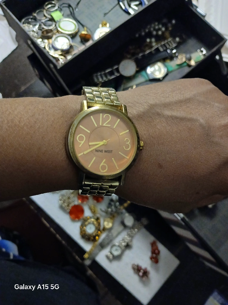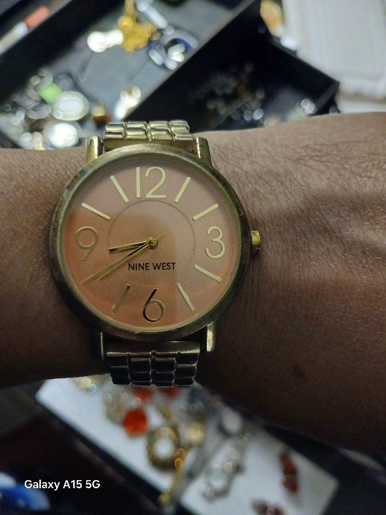 195Selling a Nine West gold watch. It has a gold band and a peach-colored face with gold numerals. It shows some signs of wear.