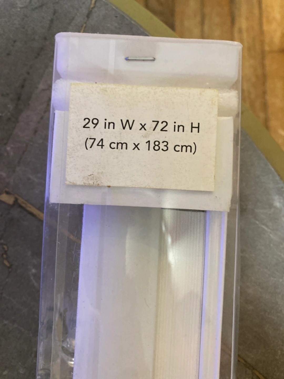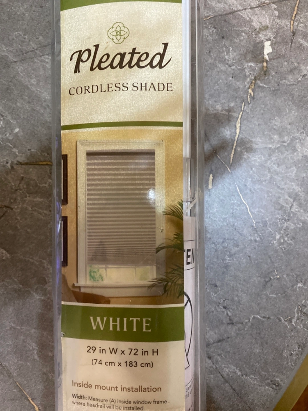 Selling a brand new Pleated Cordless Shade in white! It's 29 inches wide and 72 inches high (74 cm x 183 cm). Perfect for inside mount installation