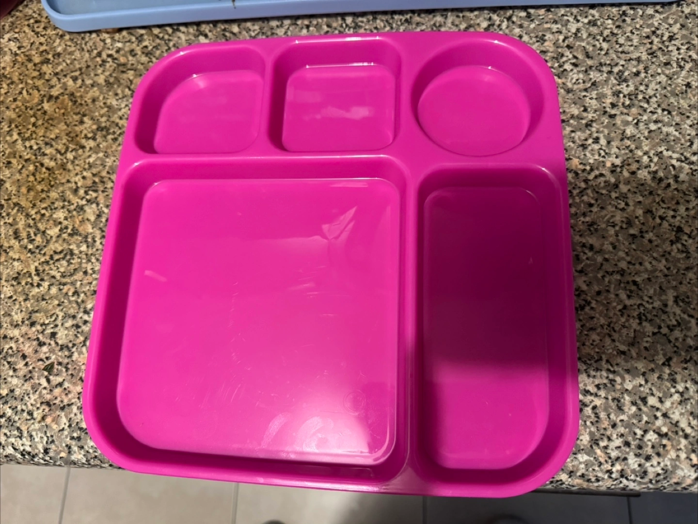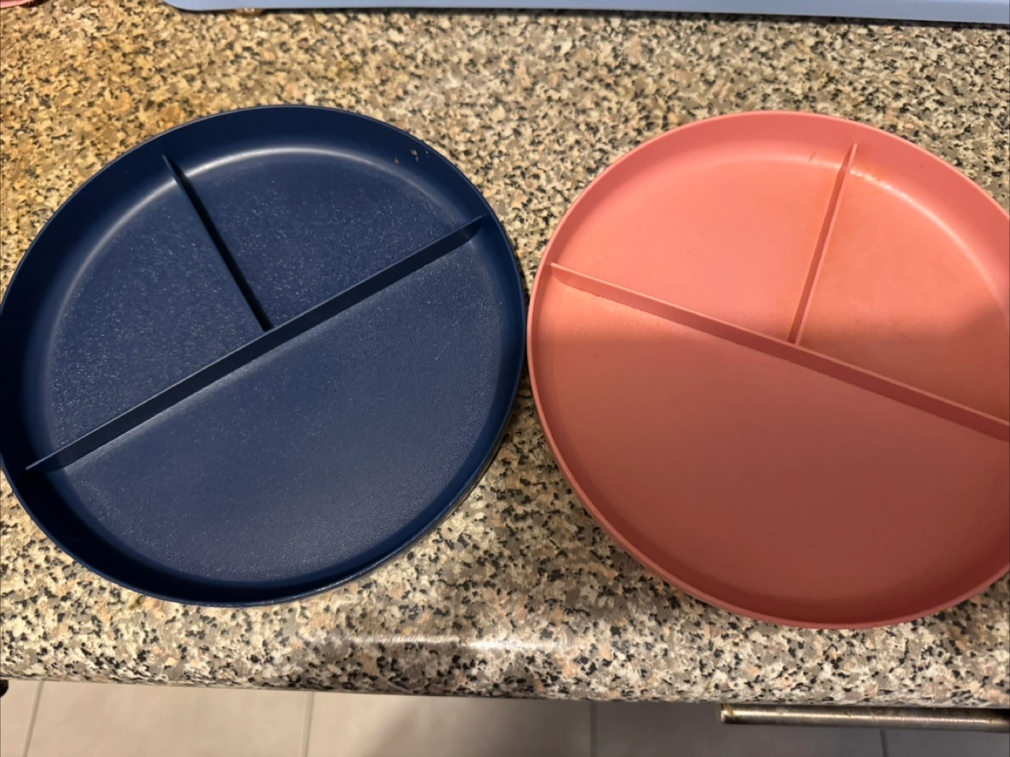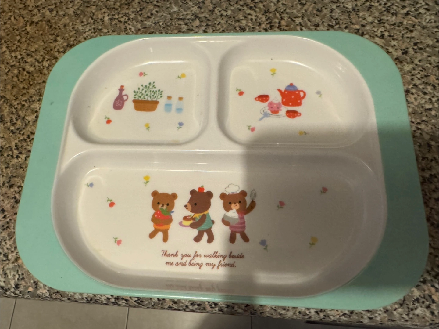 352Selling a set of divided plates for kids! There's a pink one with multiple compartments, a blue one, and a cute bear-themed plate. They're perfect for serving meals and snacks, making it easy to keep different foods separate for picky eaters
