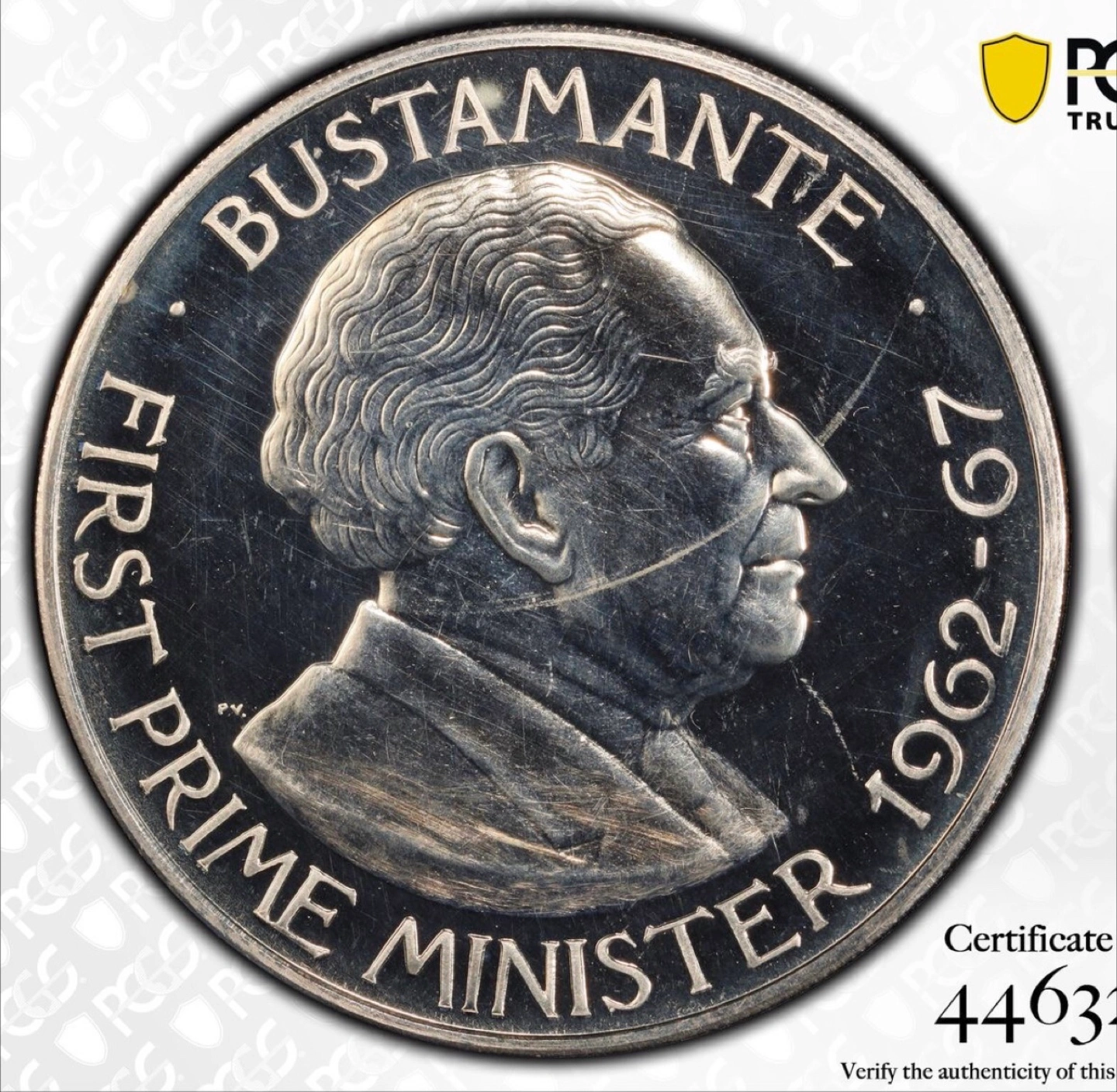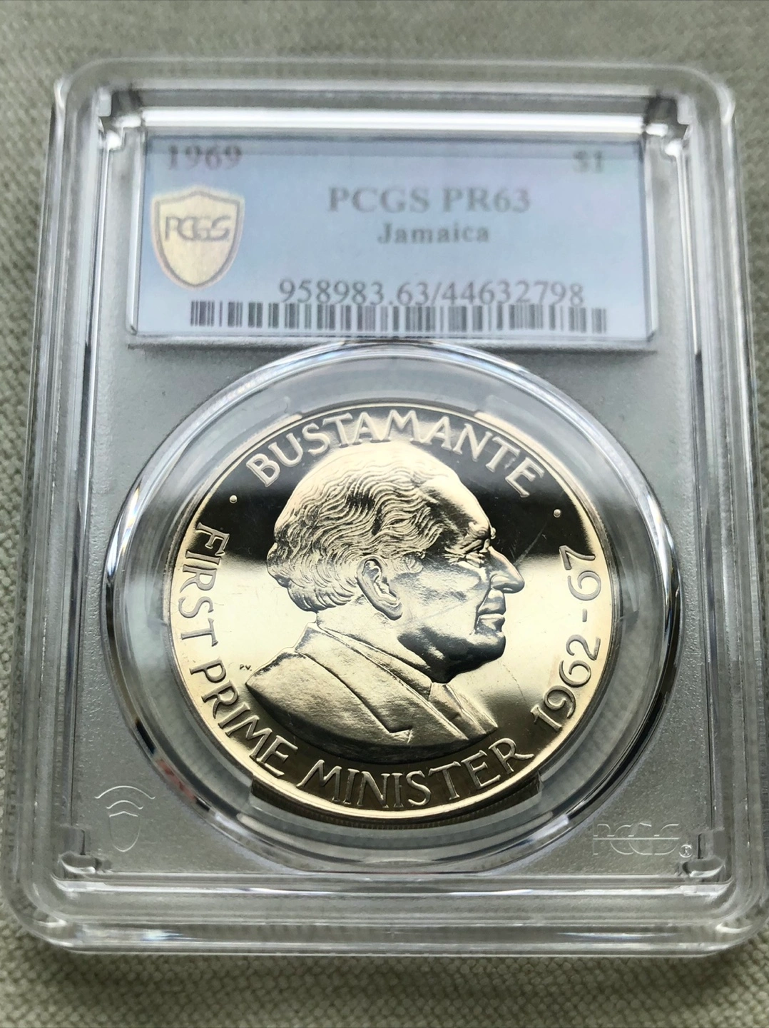TOP POP FINEST PCGS GRADED PROOF - 1969 JAMAICA FIRST DOLLAR - KM#50 No time to meet up? I can mail this coin out for $35 total (including tracked shipping) with a PayPal or Venmo payment. This is the top PCGS rated 1969 cupro-nickel one dollar coin from the island of Jamaica. - Proofs of this issue are rare. Many uncirculated sets were made, but few proofs were minted and most have been handled - The proof sets had awful plastic packaging which deteriorated and damaged most of these coins…but not this one!! Although Jamaica became independent from Great Britain in 1962, the island nation did not issue its own currency until 1969. This coin is the very first one dollar issued by Jamaica!! The obverse features the island’s first Prime Minister (Bustamante) and the reverse features the coat of arms with Arawaks and the national motto “Out of Many, One People”. Please check out my other unique items!!
