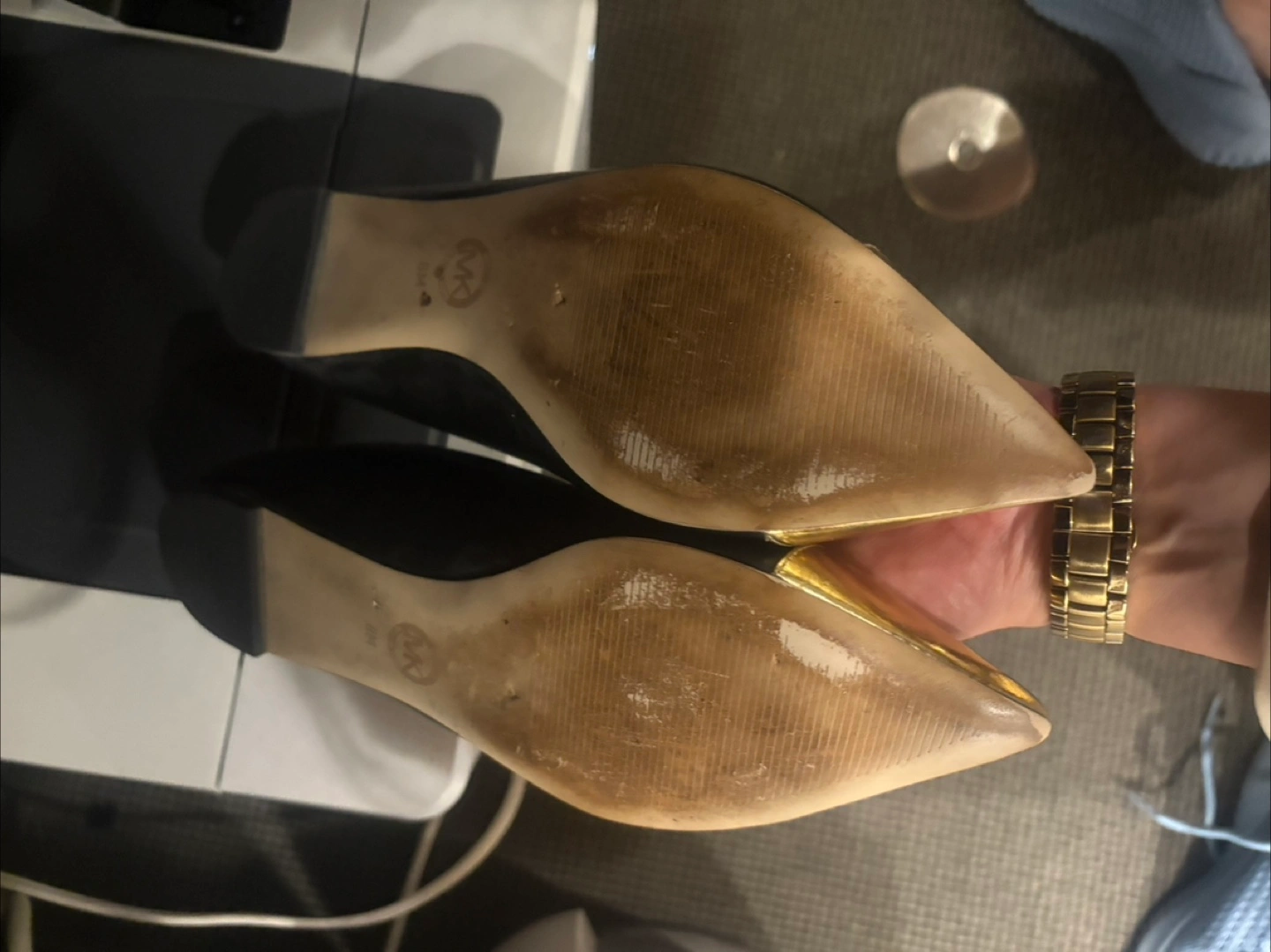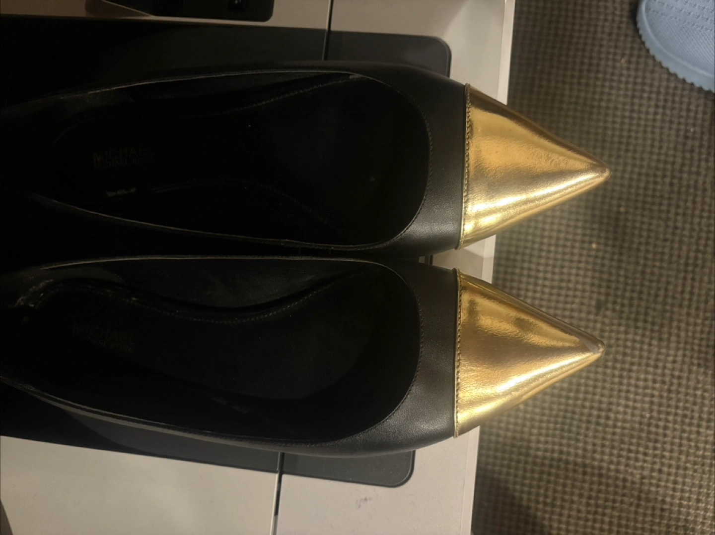 Selling a pair of Michael Kors black leather heels. These are a size 8M and have a stylish gold toe. They show some signs of wear on the soles, but are otherwise in good condition and ready for a new home
