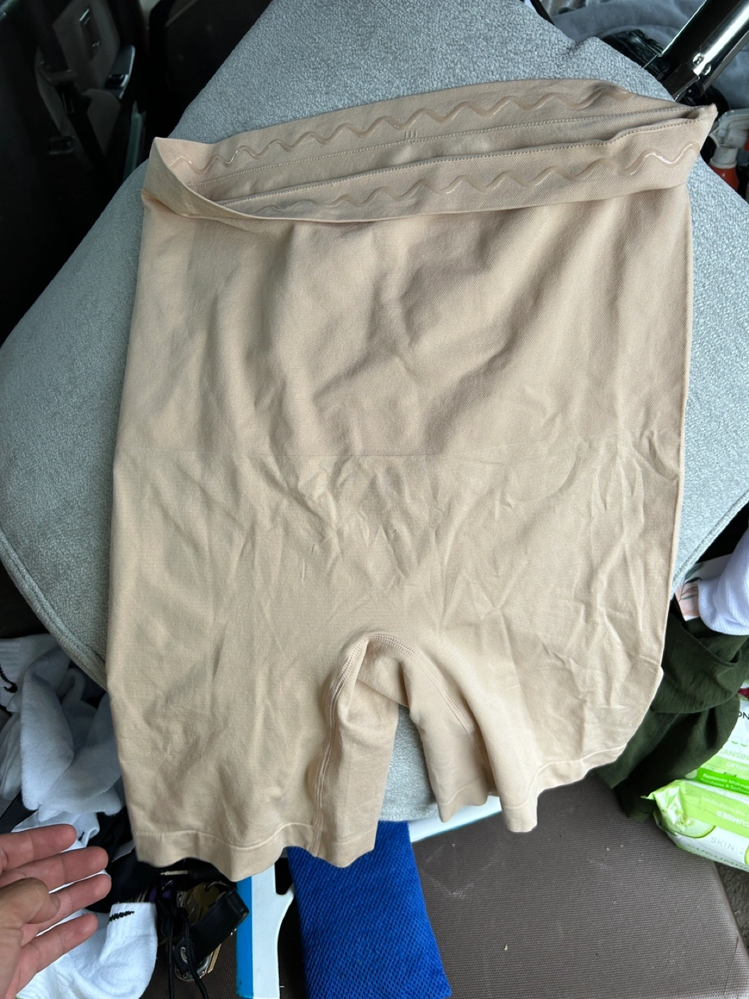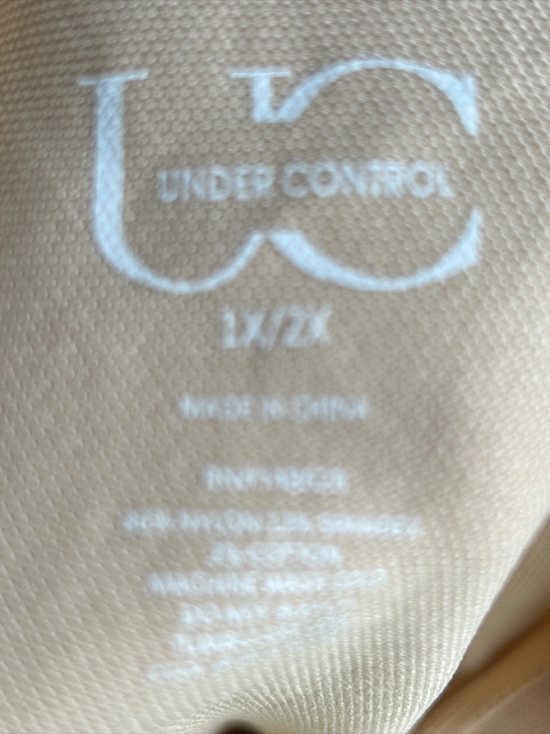 234Shapewear by Under Control in size 1X/2X. The material is 80% nylon and 20% spandex. Machine wash cold, don't bleach, and tumble dry low