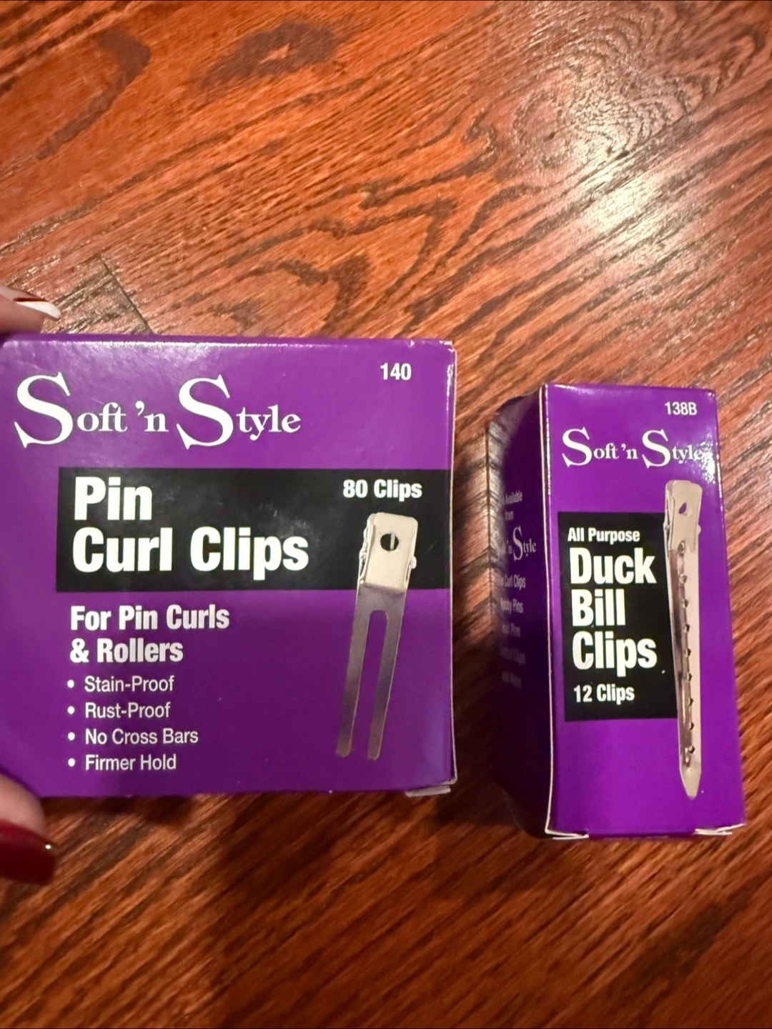I have a set of Soft 'n Style hair clips for sale! This includes both the Pin Curl Clips and the Duck Bill Clips. The Pin Curl Clips come with 80 clips and are stain-proof and rust-proof. They also feature no cross bars and provide a firmer hold. The Duck Bill Clips come with 12 clips and are all-purpose