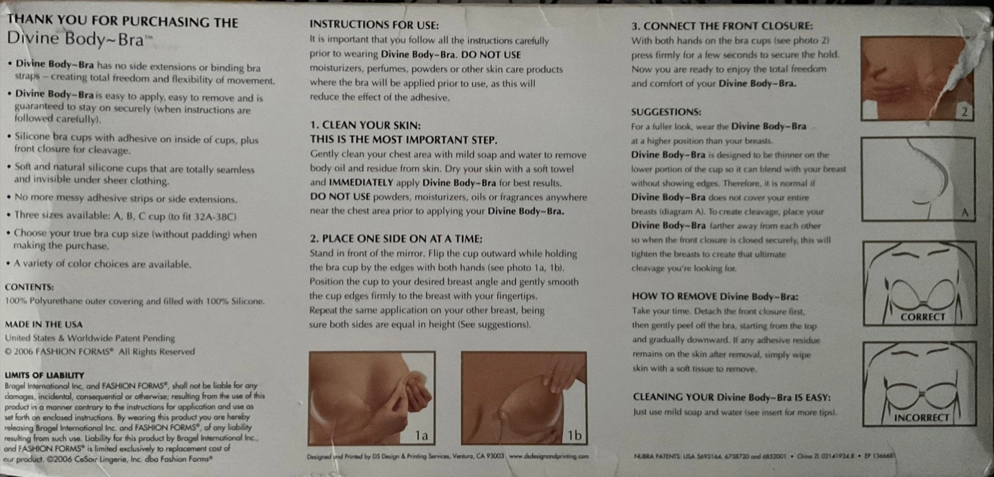 Selling a BRAND NEW Fashion Forms NuBra Divine Body-Bra. (cup fit 32A-38C). It's made of 100% polyurethane outer covering and filled with 100% Silicone. It can be worn more than 100 times when applied as instructed
