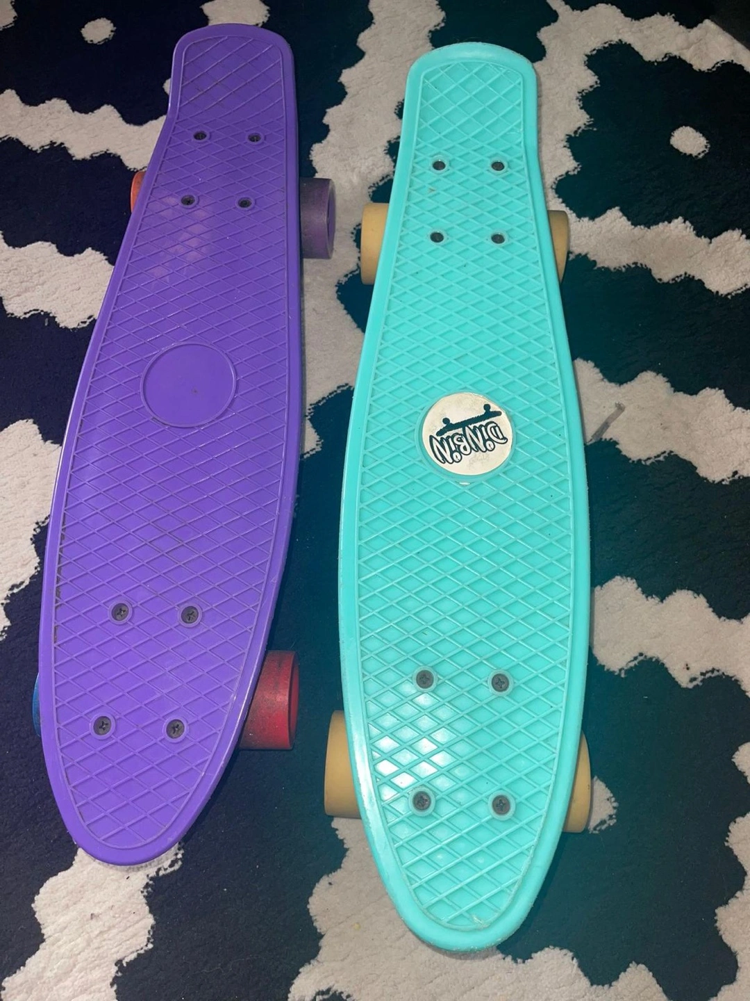 Selling two mini longboard skateboards. Grab your Discounted Longboard Pastel Mini Cruiser 22 inch Skateboard" Complete Led Light Flashing while the store LAUNCH DISCOUNT is on. Once we reach 100-unit sales, we will be increasing the price back up to $105.99. This is absolutely a great gift! ORDER NOW because these are FLYING off our shelves! Limit to 5 per customer max! Product Descriptions Board Category: Single Rocker Material: PP plastic+ Aluminum +PU Size: 22"*6" is_customized: Yes Type: Long Board Deck material: 100% fresh high strength pp with fiber Turcks material: Aluminum steel Wheel material: high strength gel pu Deck color: red,orange,blue,green,purple,pink,black Truck color: red,orange,blue,green,purple,pink,black,yellow,white,raw Wheel color: transparent purple,yellow,blue,green,white,black,red Bearing: ABEC-7 industrial standard "608" size Wheel hardness: 85A Max loading: 100kg Fit People: Men Women Kids Girls Boys