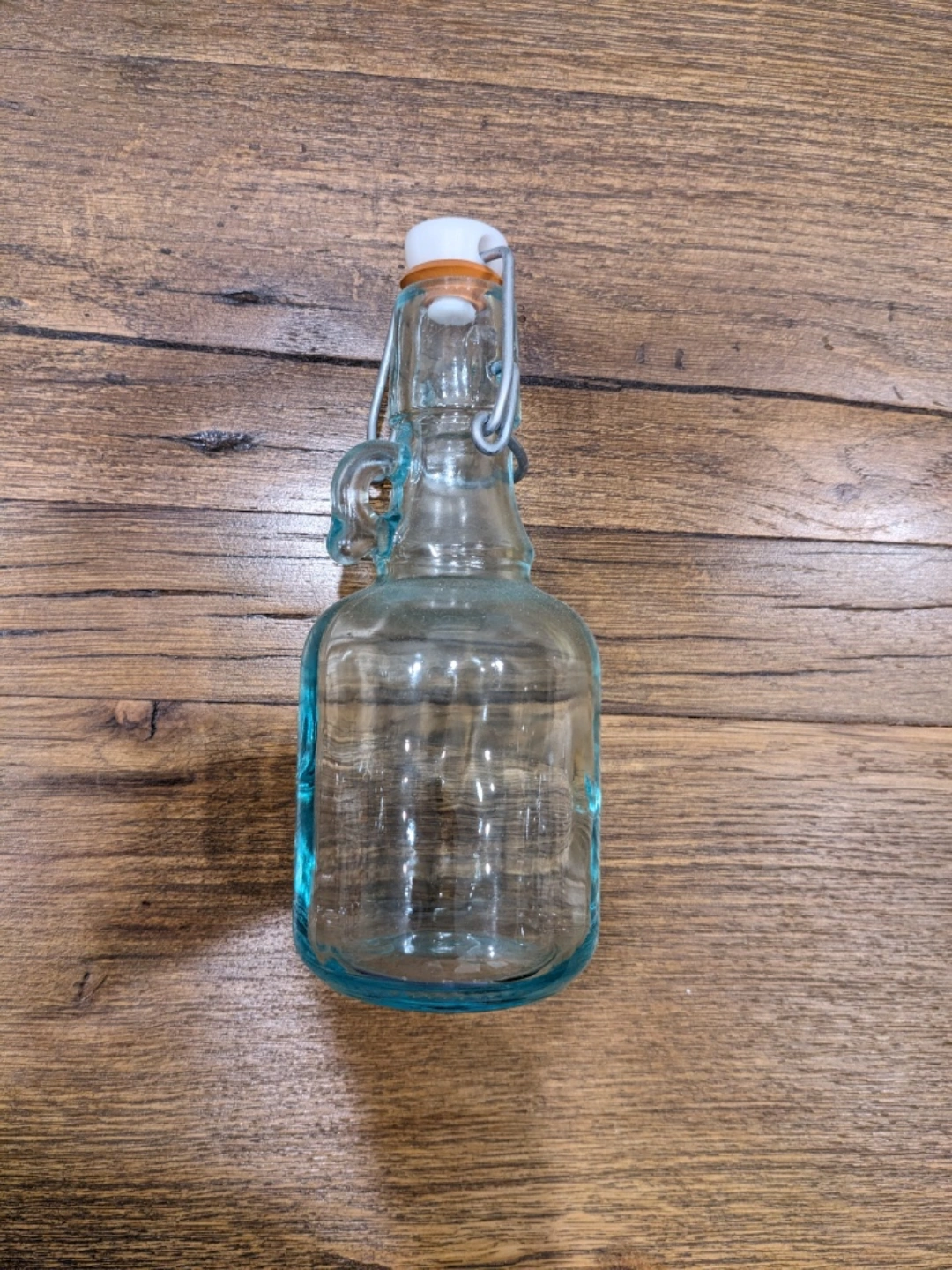 893Here's a cute glass bottle with a swing top! It's perfect for storing homemade beverages or dressings. The clear glass lets you see what's inside, and the swing top makes it easy to open and close. It's in great condition and ready for a new home