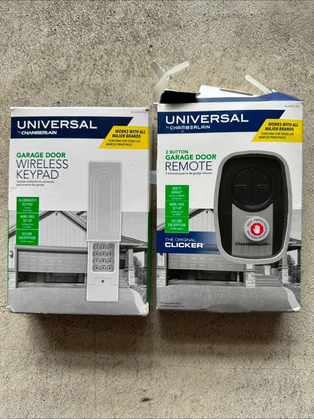 I have a Chamberlain Universal Garage Door Wireless Keypad and a 2-Button Garage Door Remote for sale. Both are compatible with all major brands and offer secure encryption. The remote has an 800 ft range and wire-free setup, making it super convenient! Both come in their original boxes.