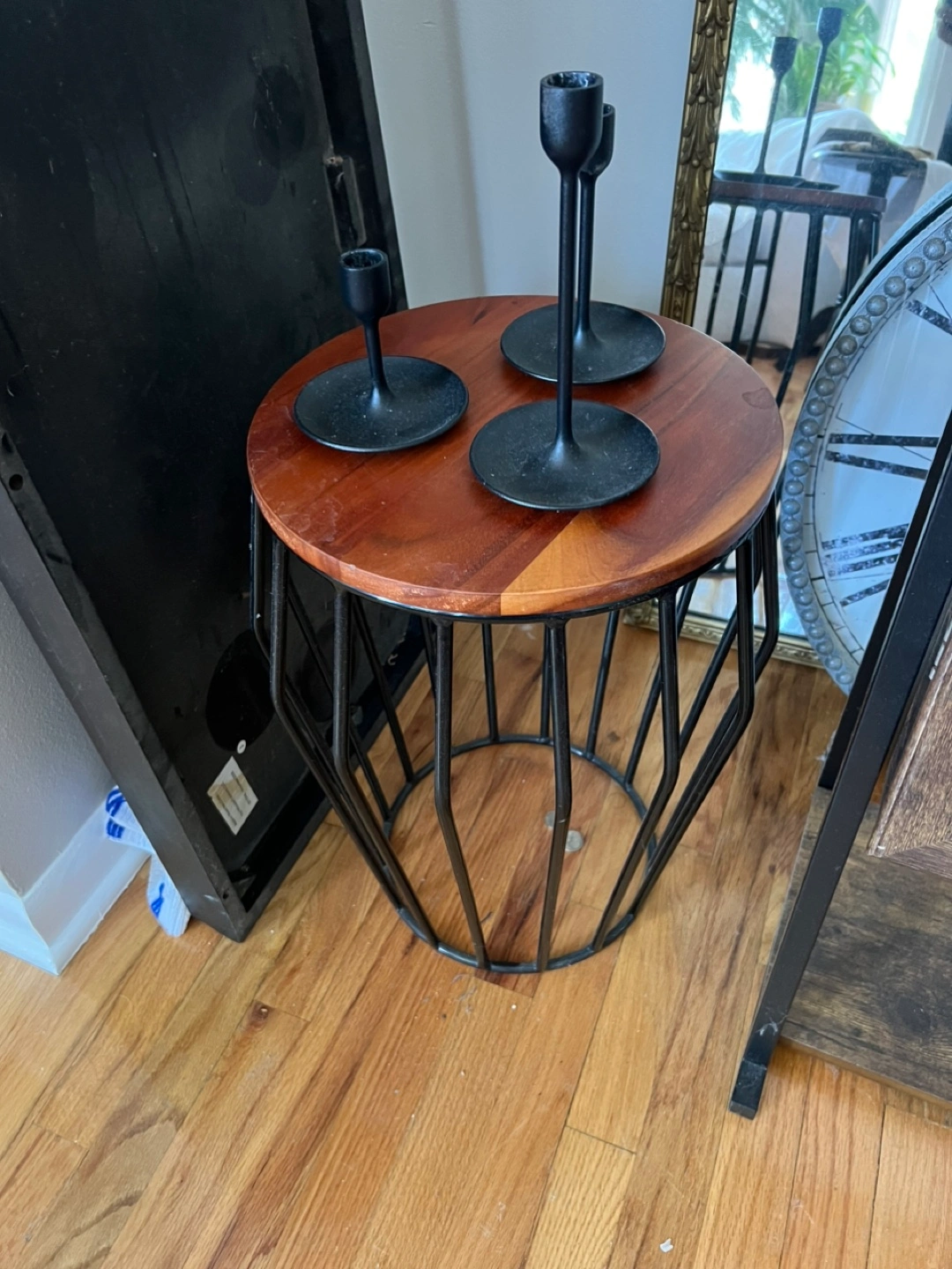 Selling a cute round side table! It has a wood top and a black metal cage-like base. Perfect for small spaces or as a nightstand, black candle holders included.