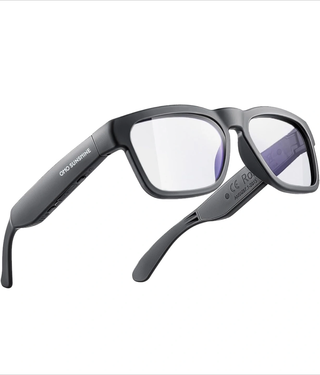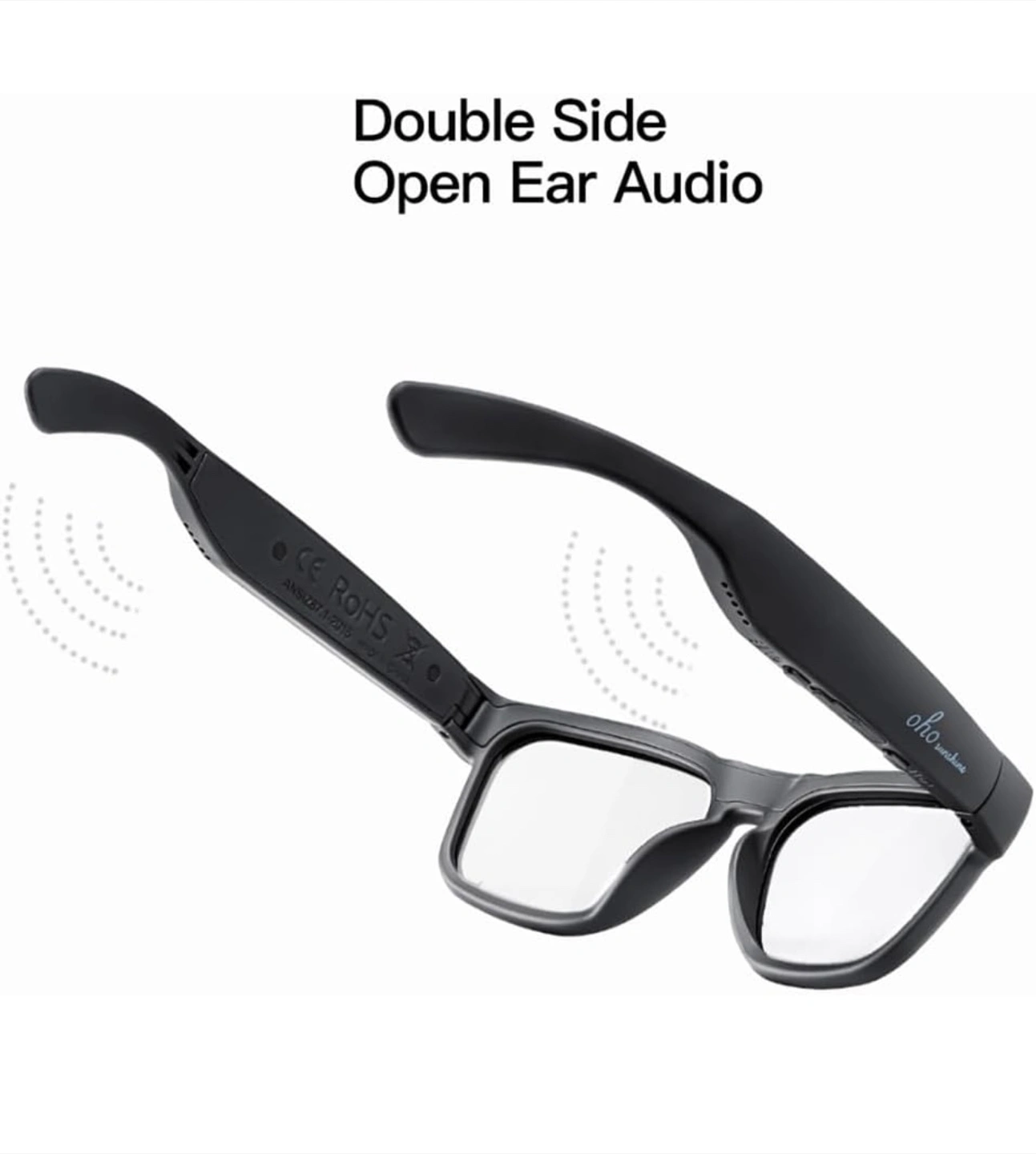 Selling a pair of Oho Sunshine 03 audio glasses. These glasses feature double-sided open ear audio, so you can listen to music or podcasts while still being aware of your surroundings. They also have blue light blocking lenses.