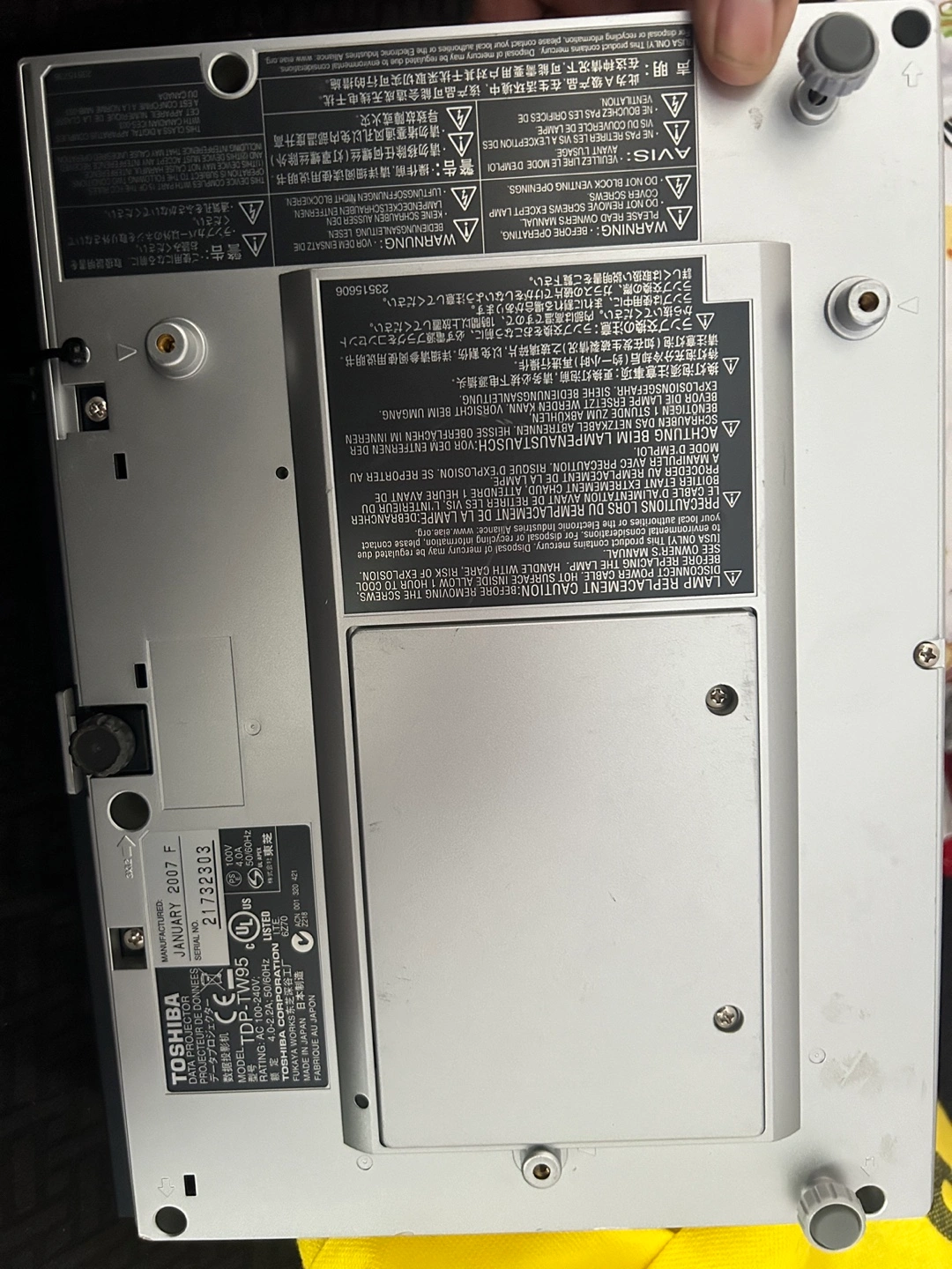 213Selling a Toshiba TDP-TW95 data projector. It has various input and output ports including audio, video, computer, and S-Video. The projector was manufactured in January 2007. Selling a Toshiba TDP-TW95 data projector. Never used it. Don’t know if it works. Letting go for $35 Good condition. Doesn’t have any cables.