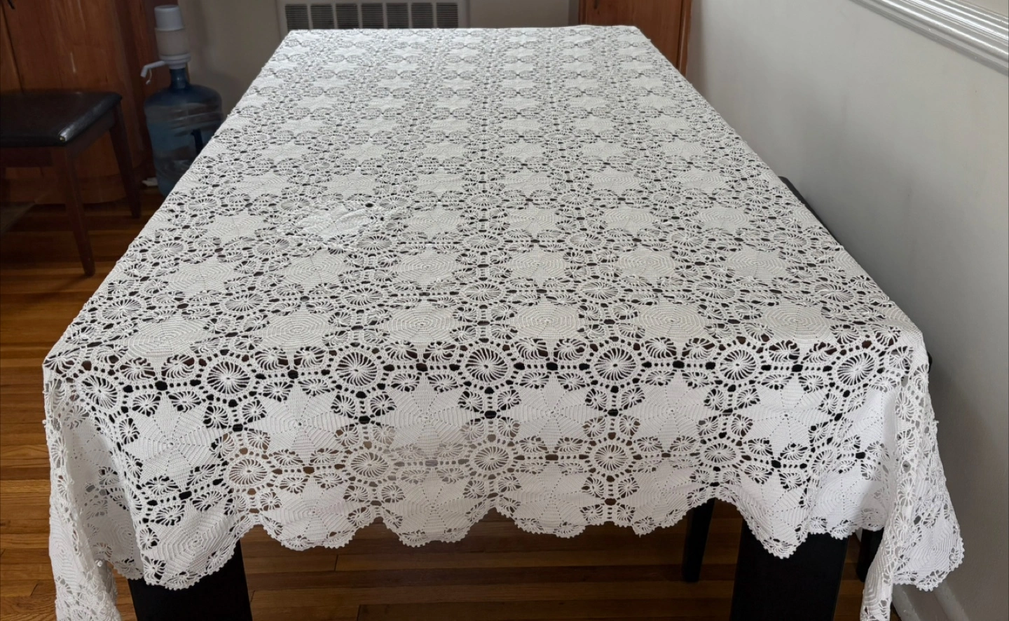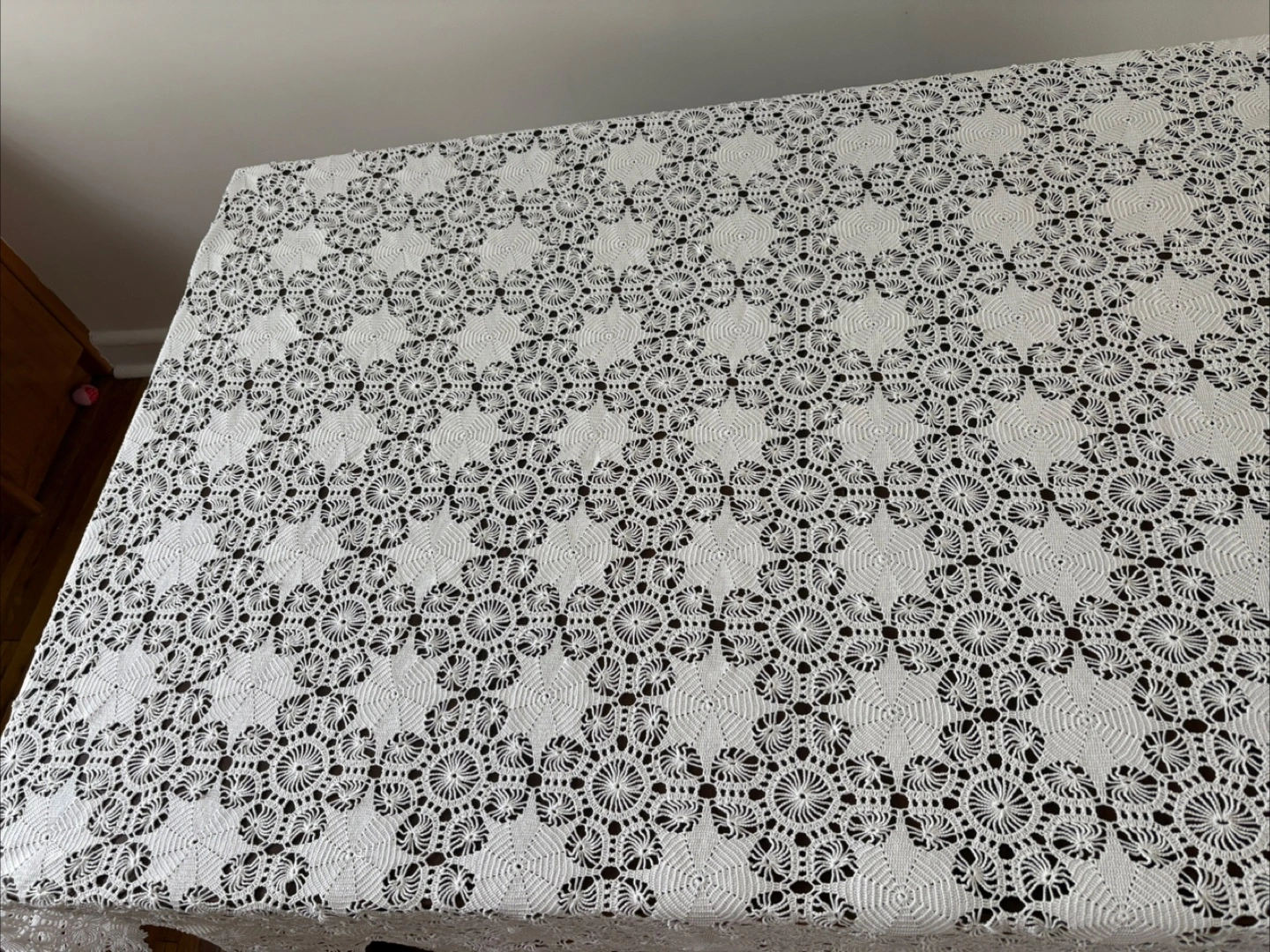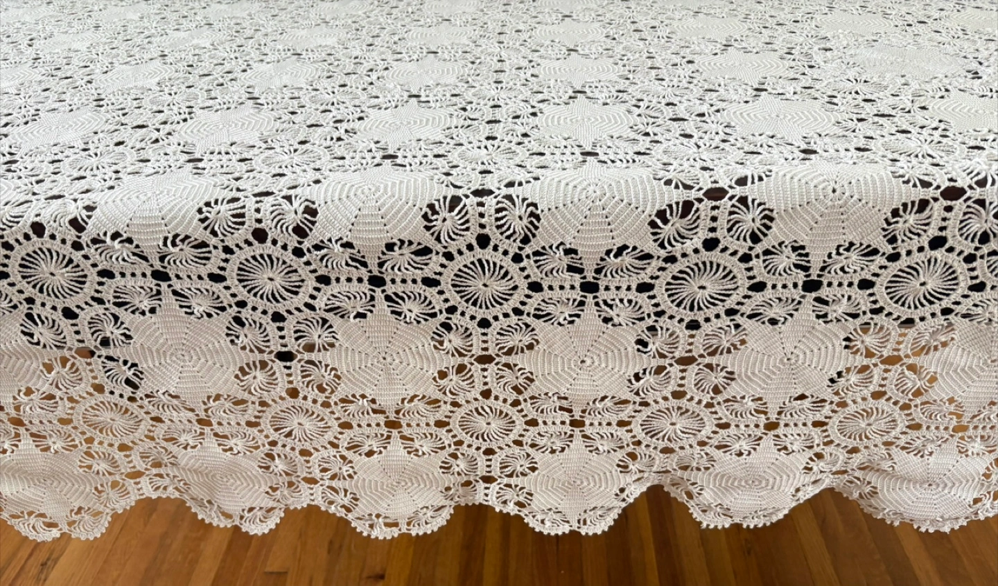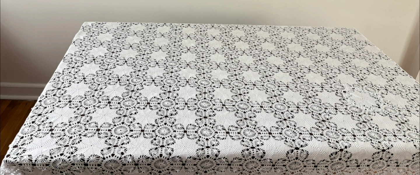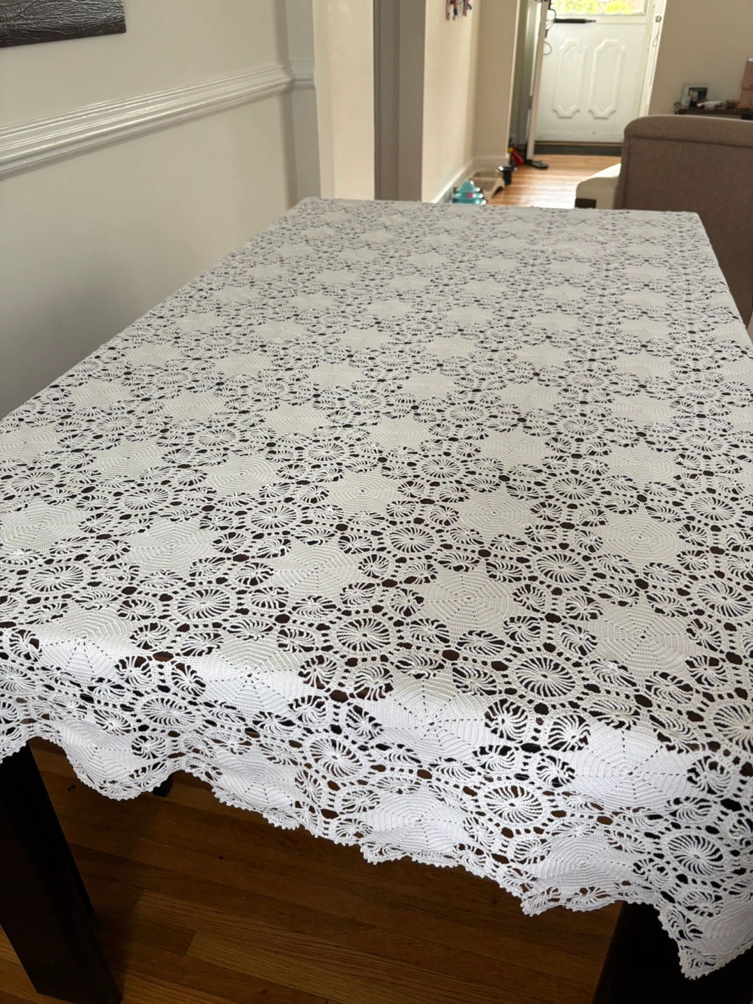 Beautiful white crochet tablecloth in great condition! It adds a lovely, delicate touch to any table setting. Perfect for adding a vintage or handmade touch to your home decor