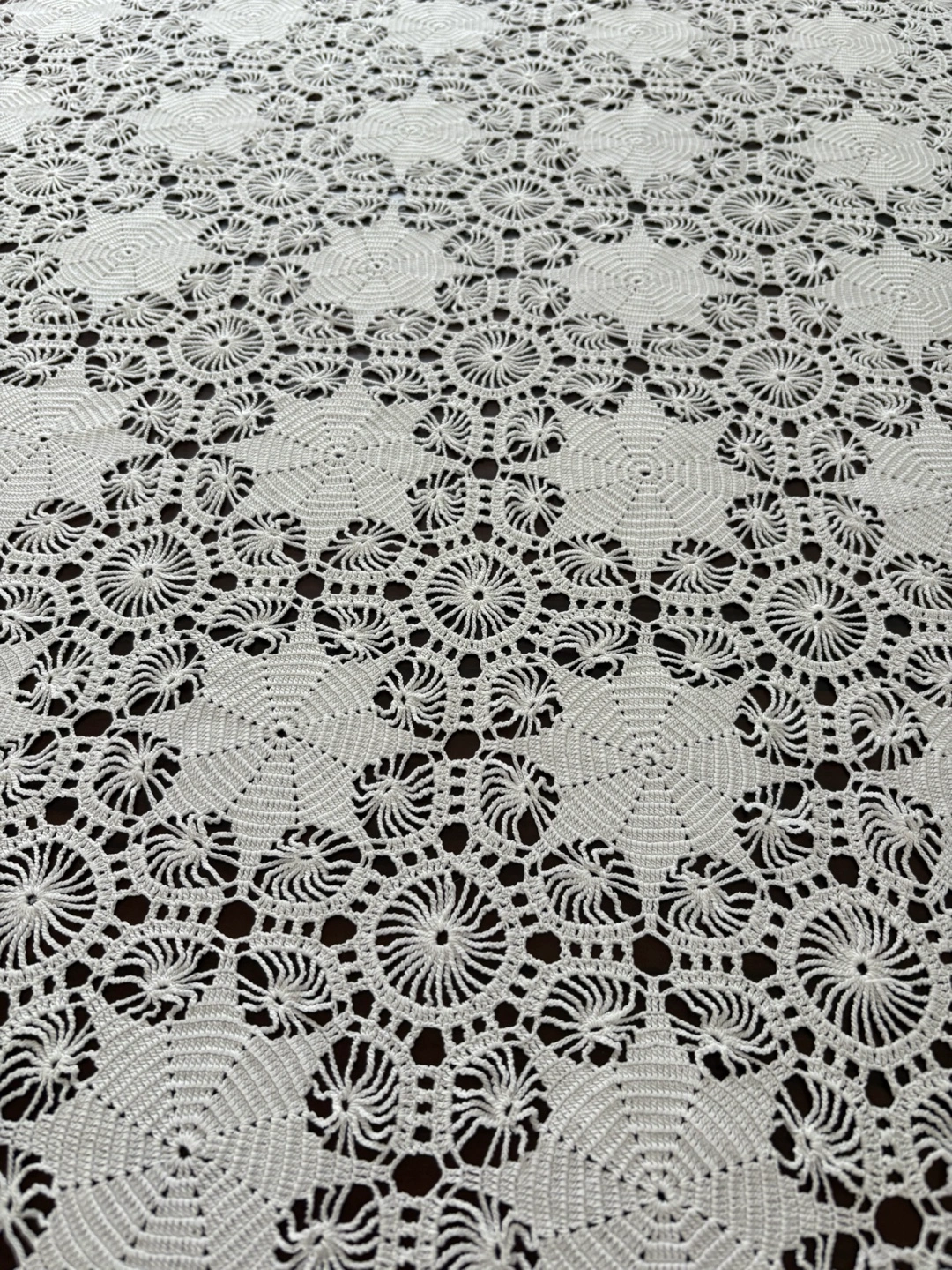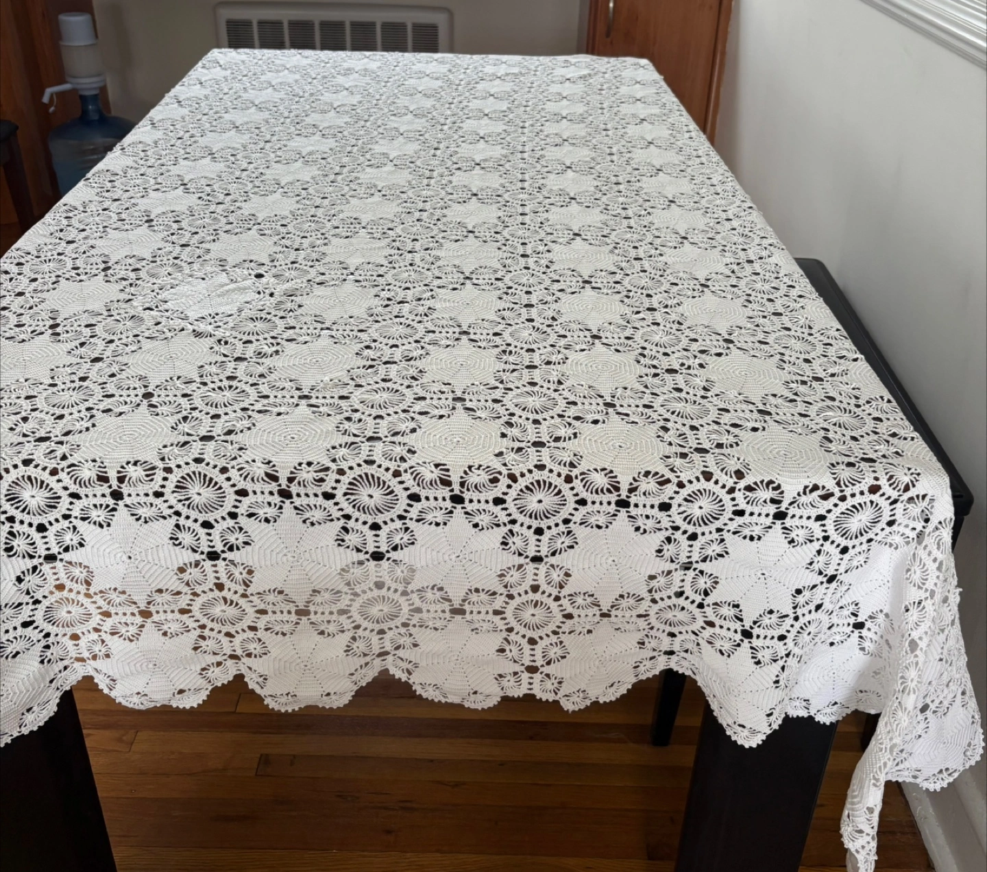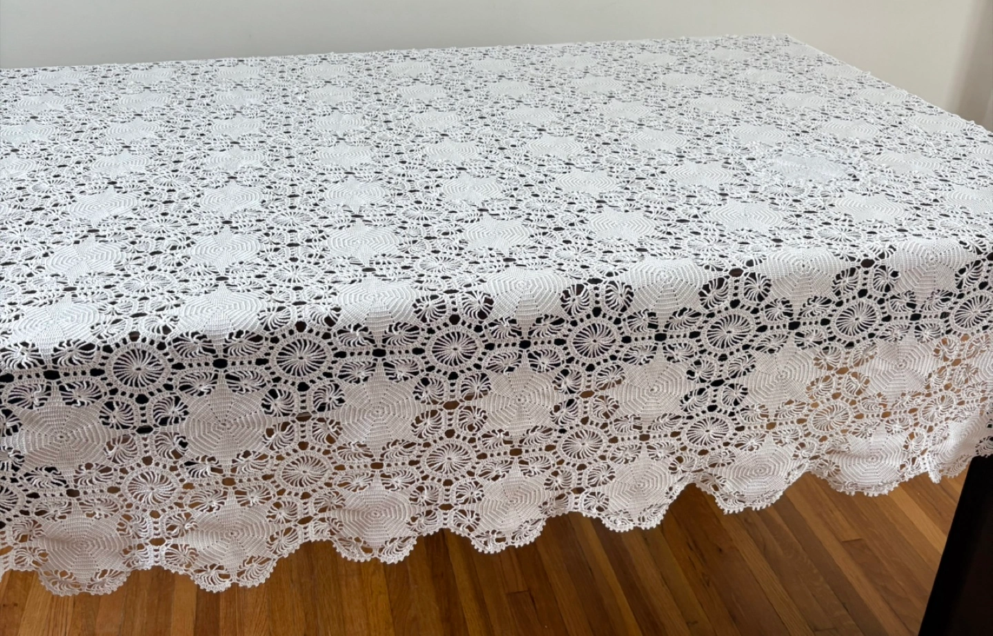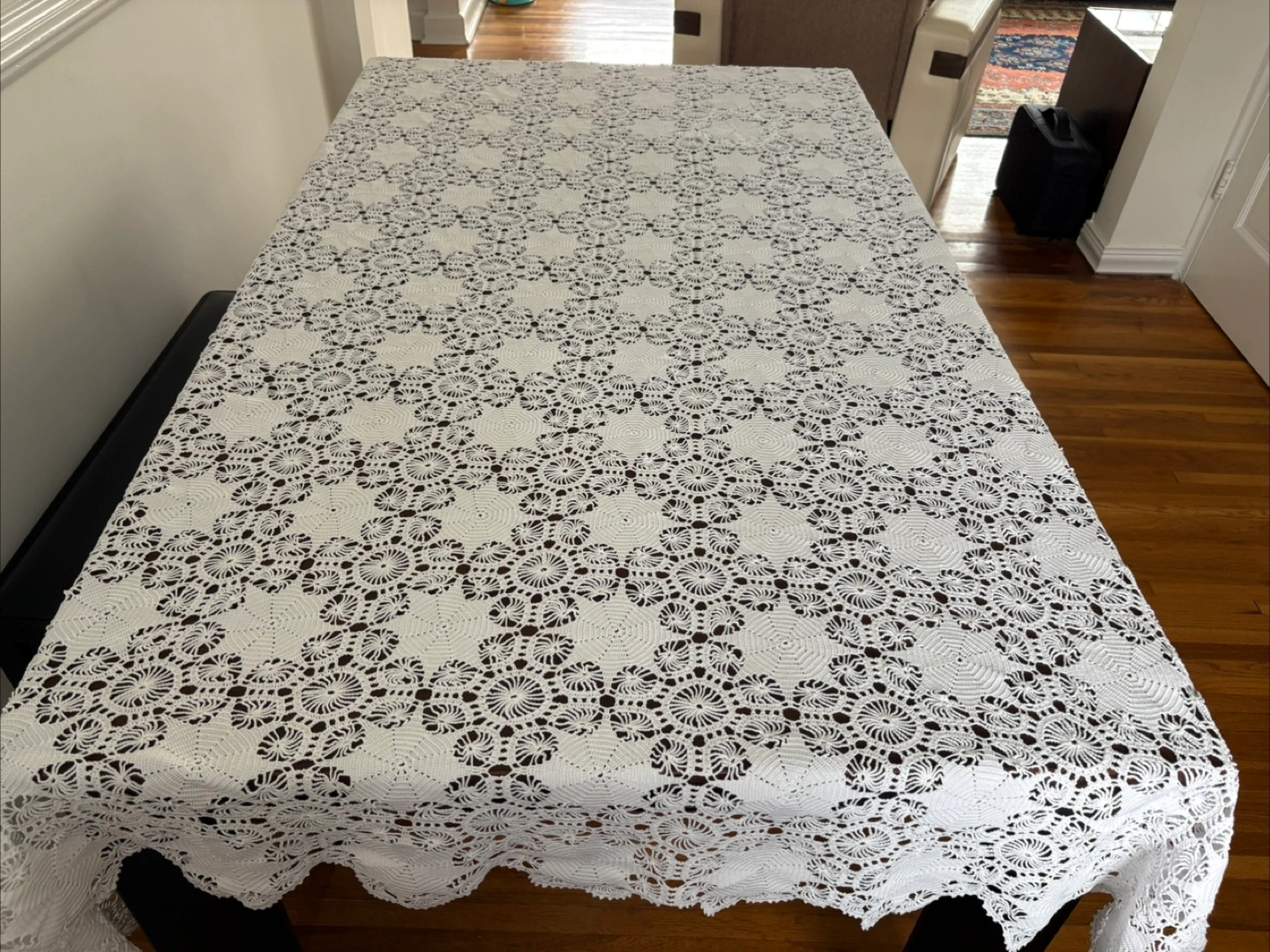 Beautiful white crochet tablecloth in great condition! It adds a lovely, delicate touch to any table setting. Perfect for adding a vintage or handmade touch to your home decor