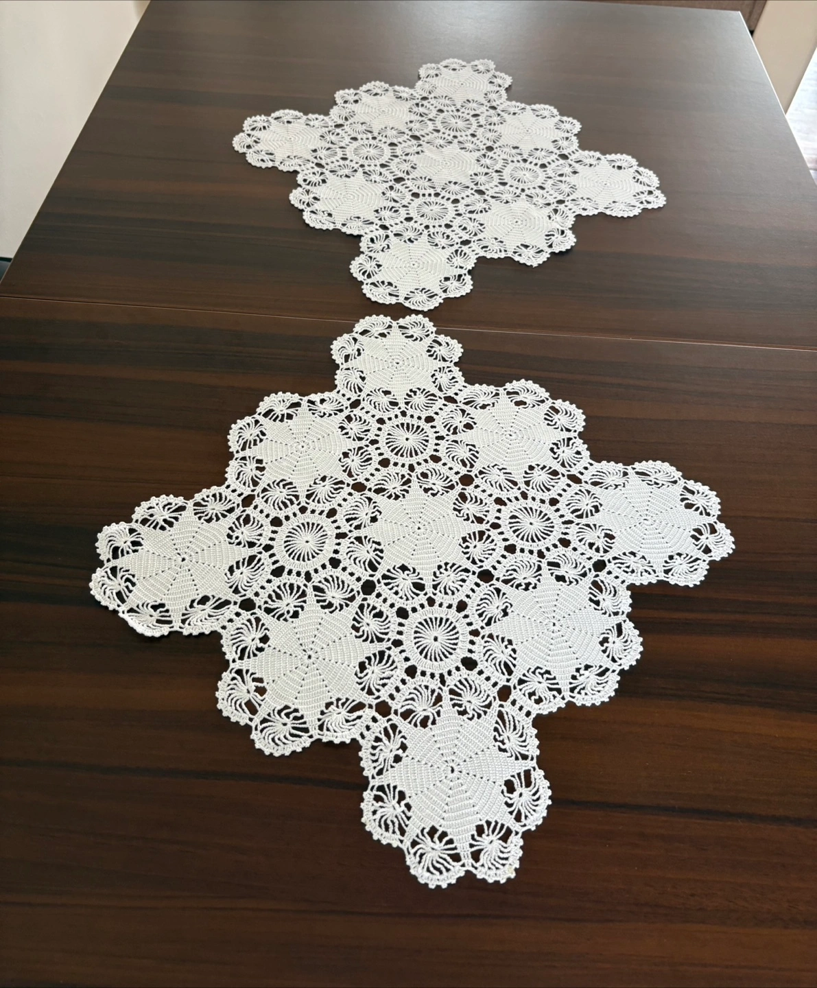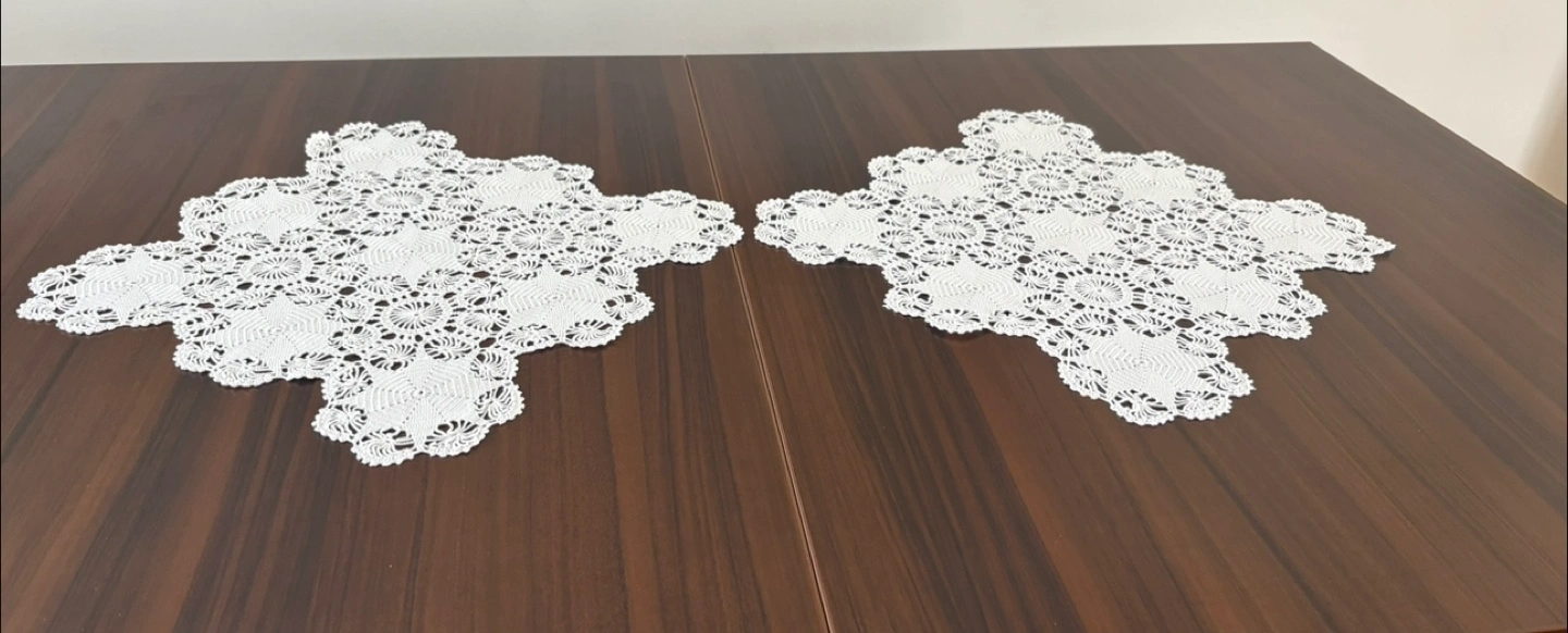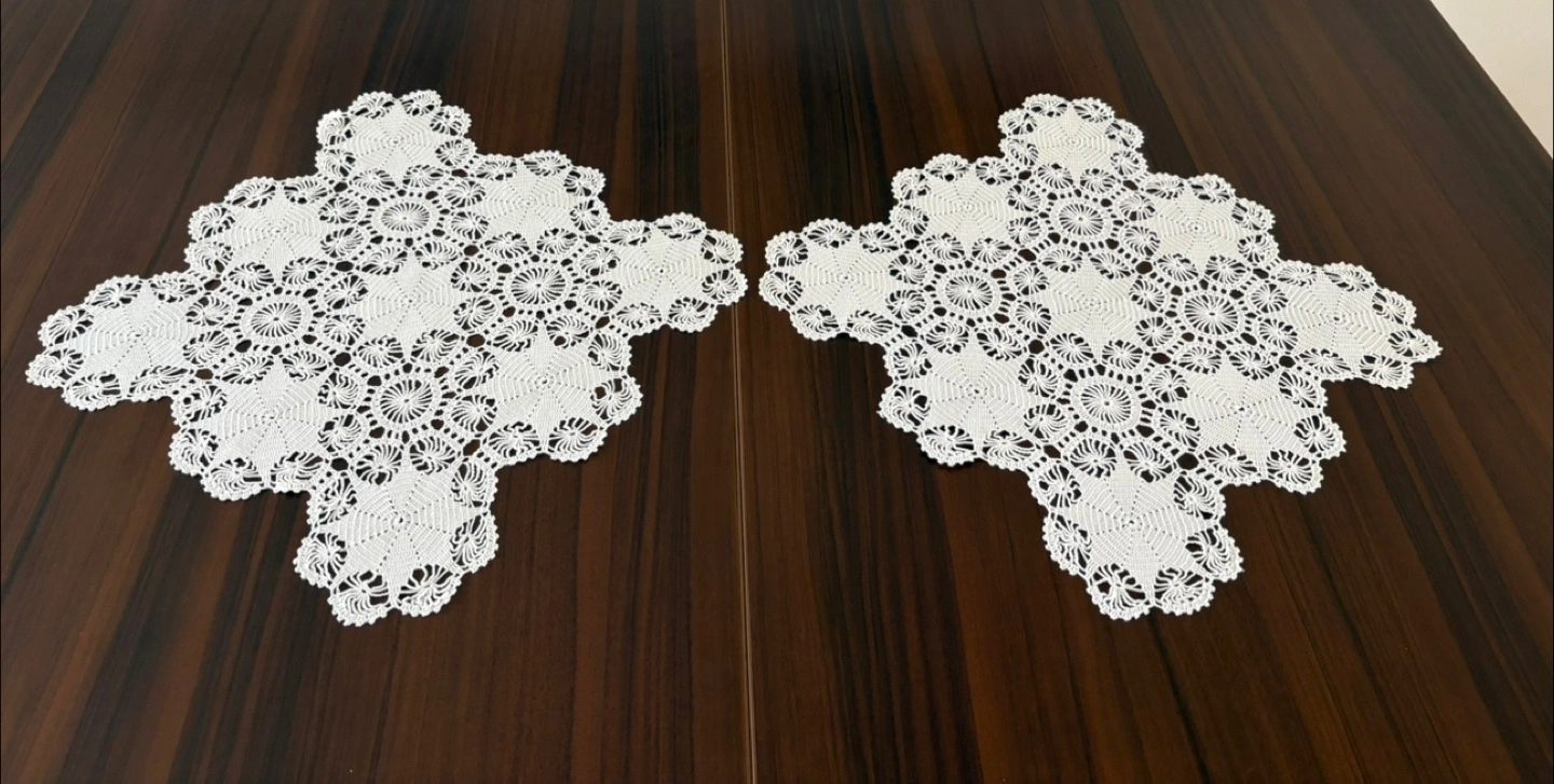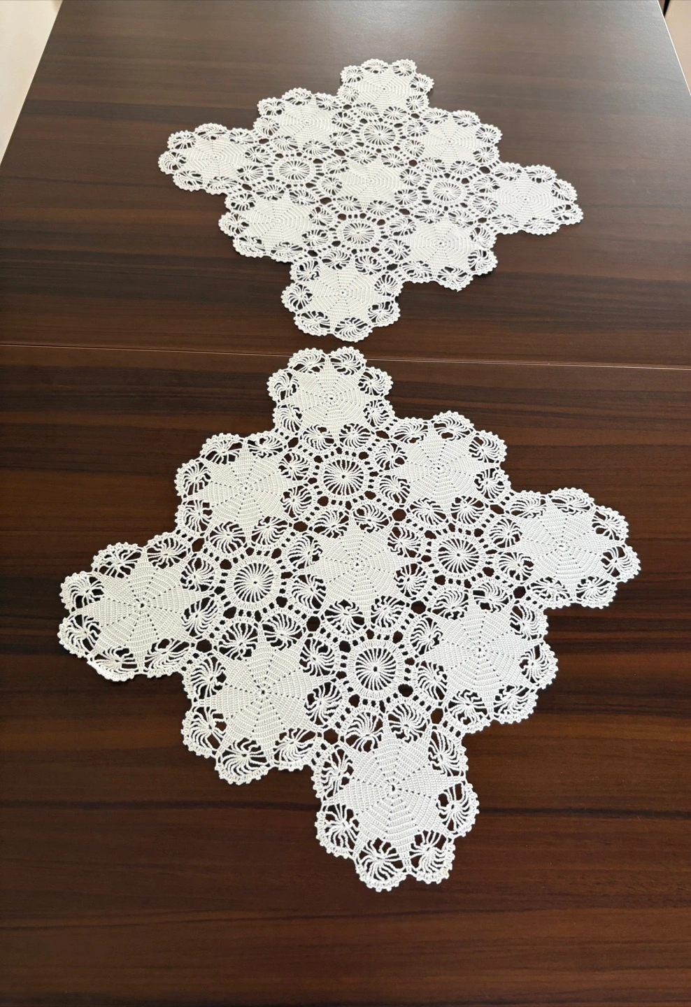I'm selling a set of two handmade crochet doilies in white. They have a beautiful, intricate design. Perfect for adding a touch of vintage charm to your home!