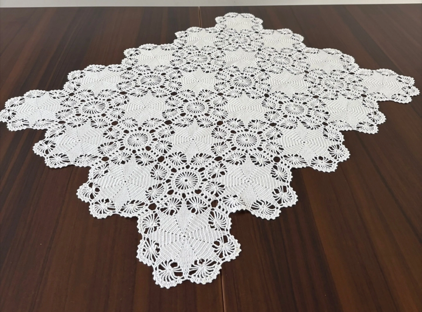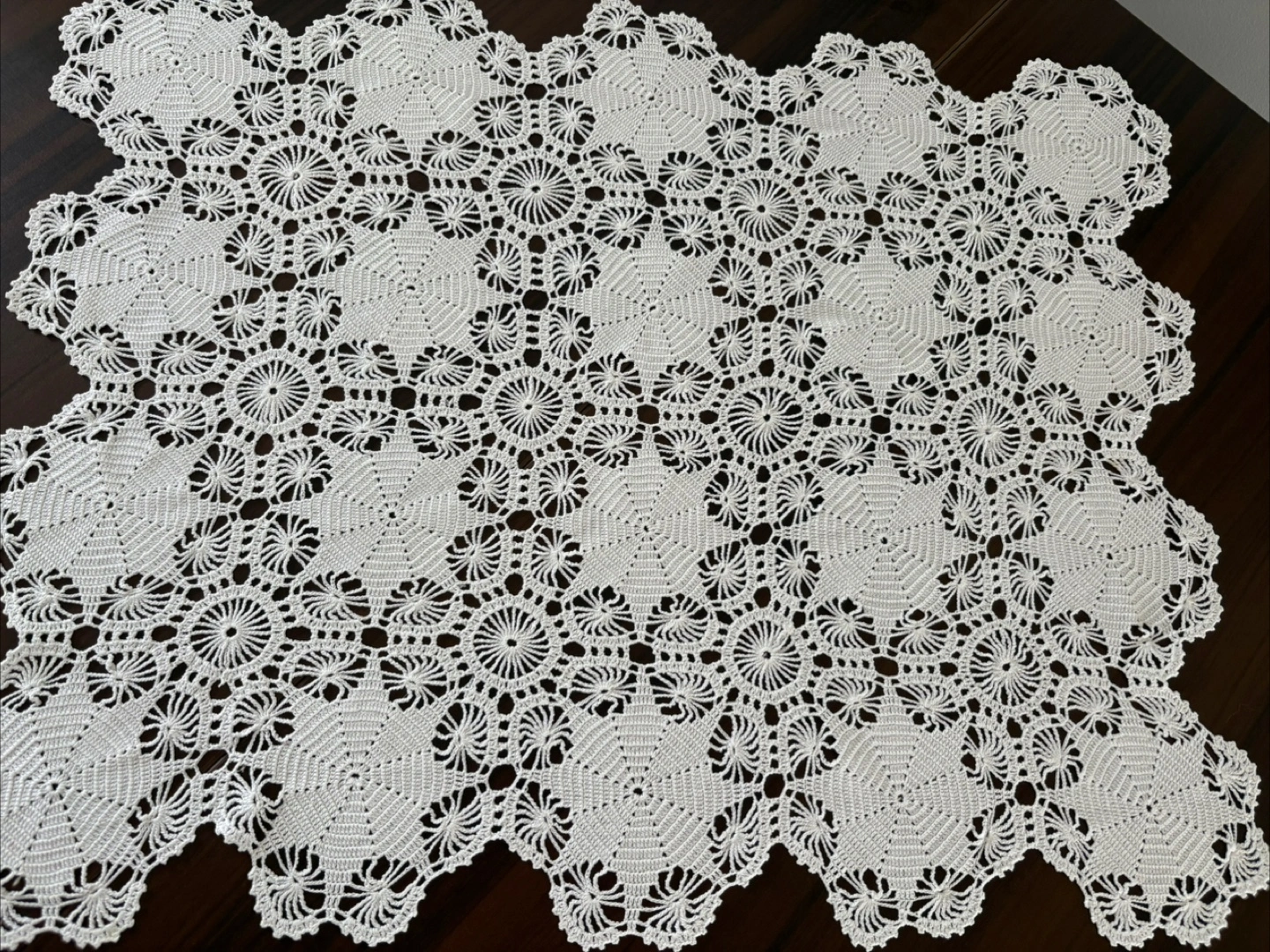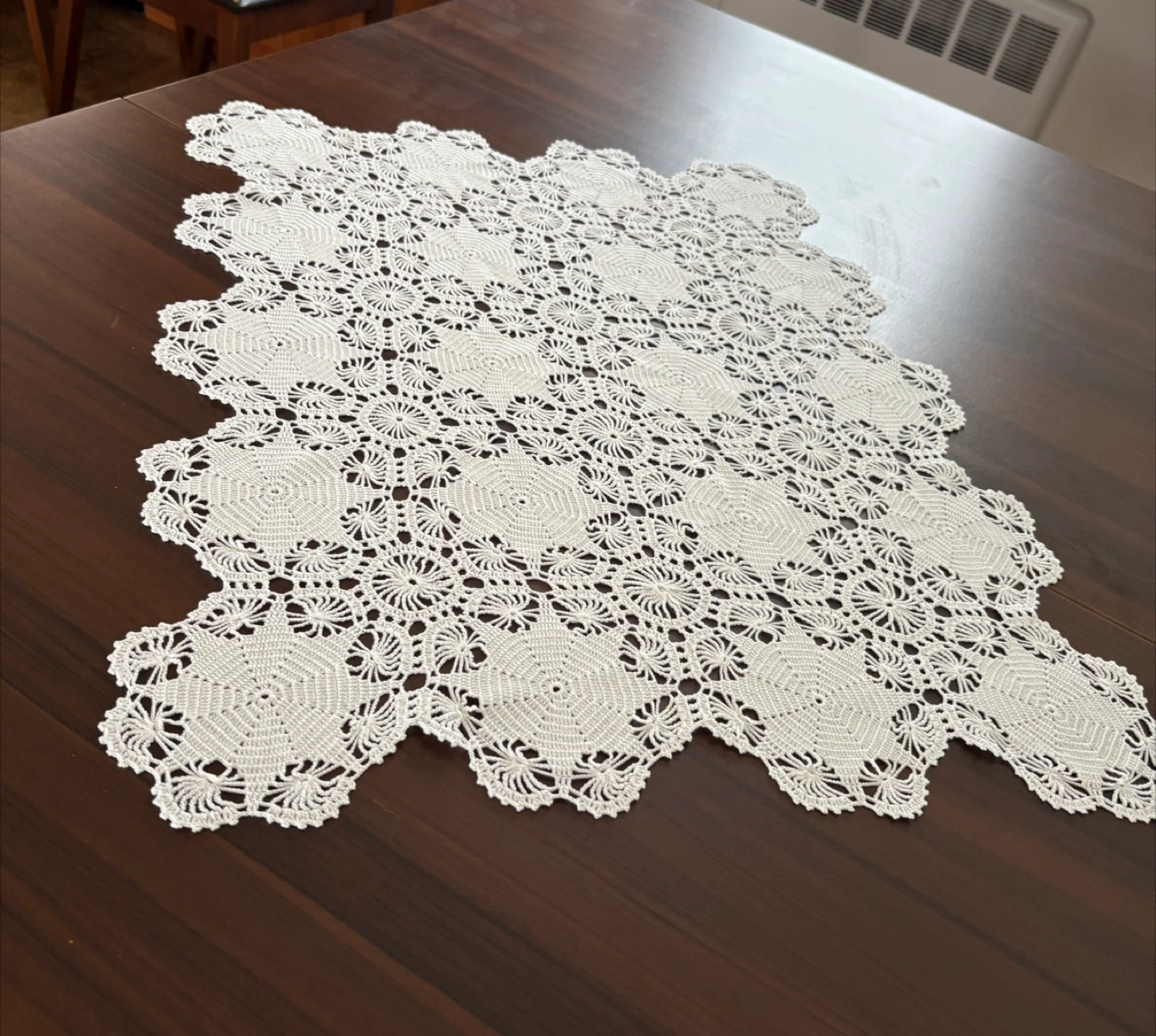 Selling a beautiful handmade crochet table runner. It's a lovely white color and would look great on any table. The intricate design adds a touch of elegance to your home decor. It's in excellent condition and ready to brighten up your space!