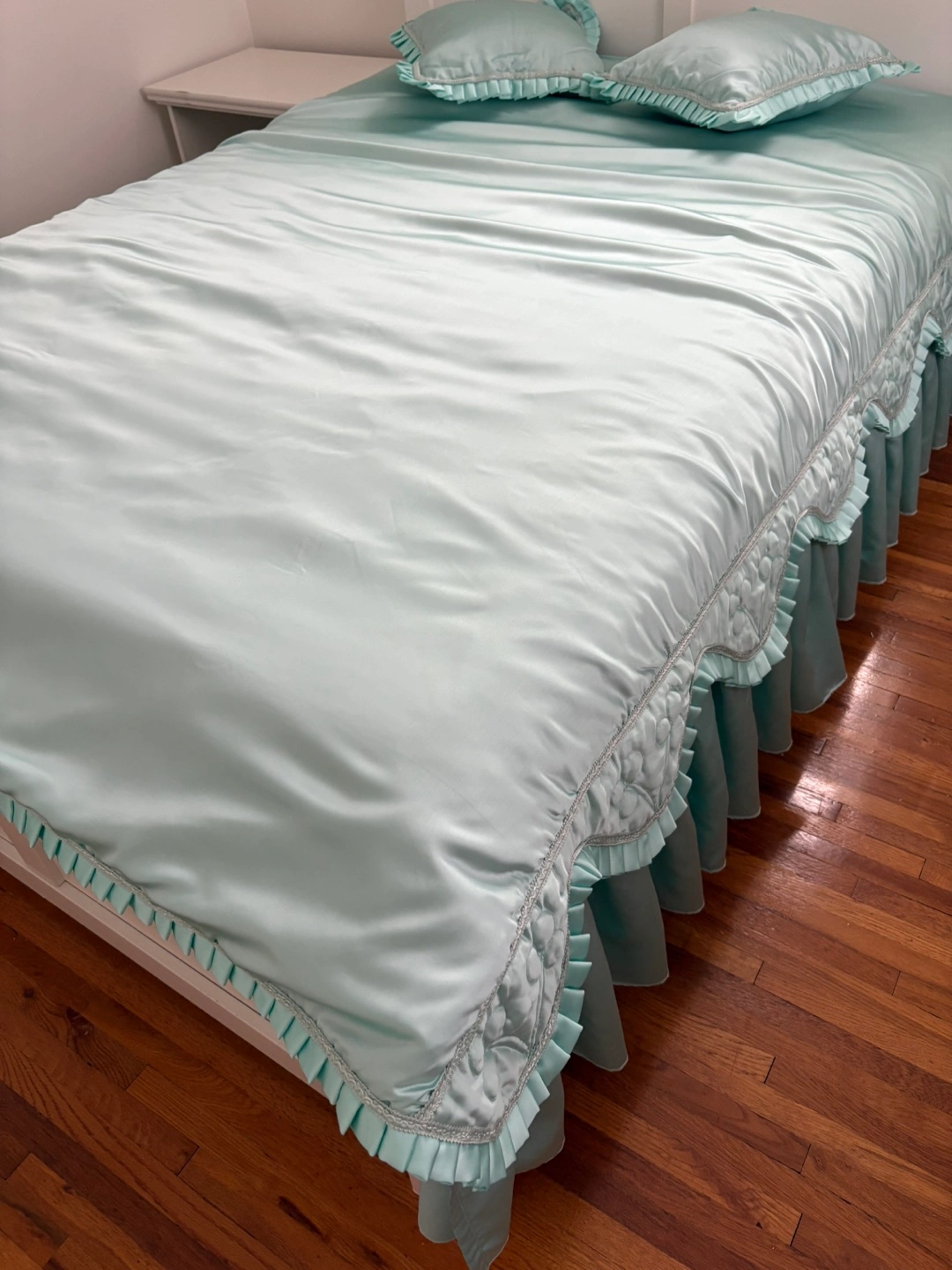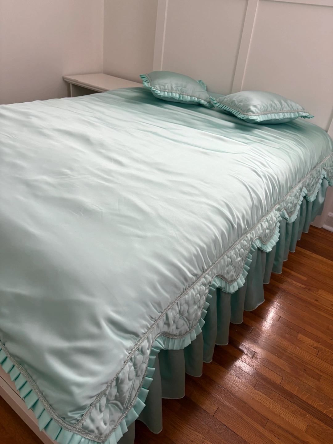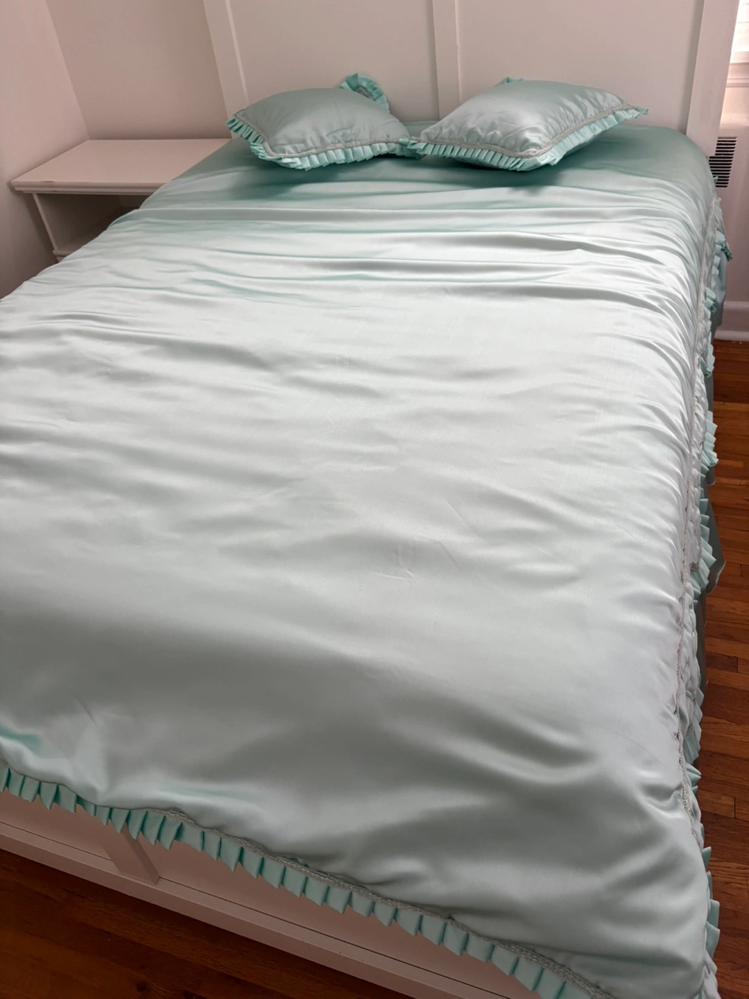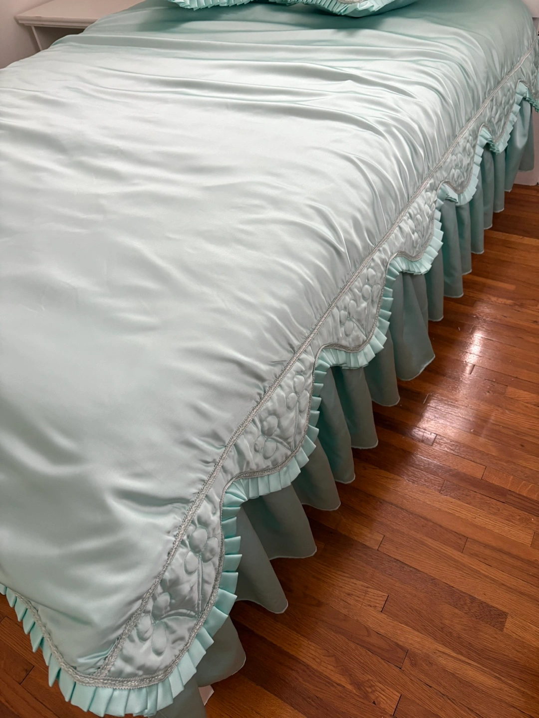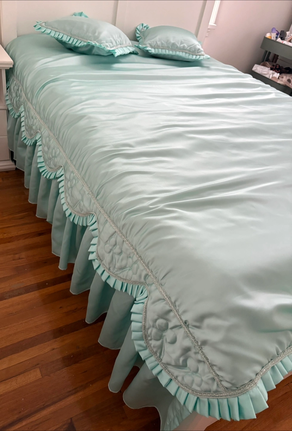 Selling a light Green bedspread with matching pillows! It's in great condition and would look lovely in any bedroom. The bedspread features a decorative ruffled edge and a floral pattern. This set includes the bedspread and two pillow shams. Size: Queen and Full