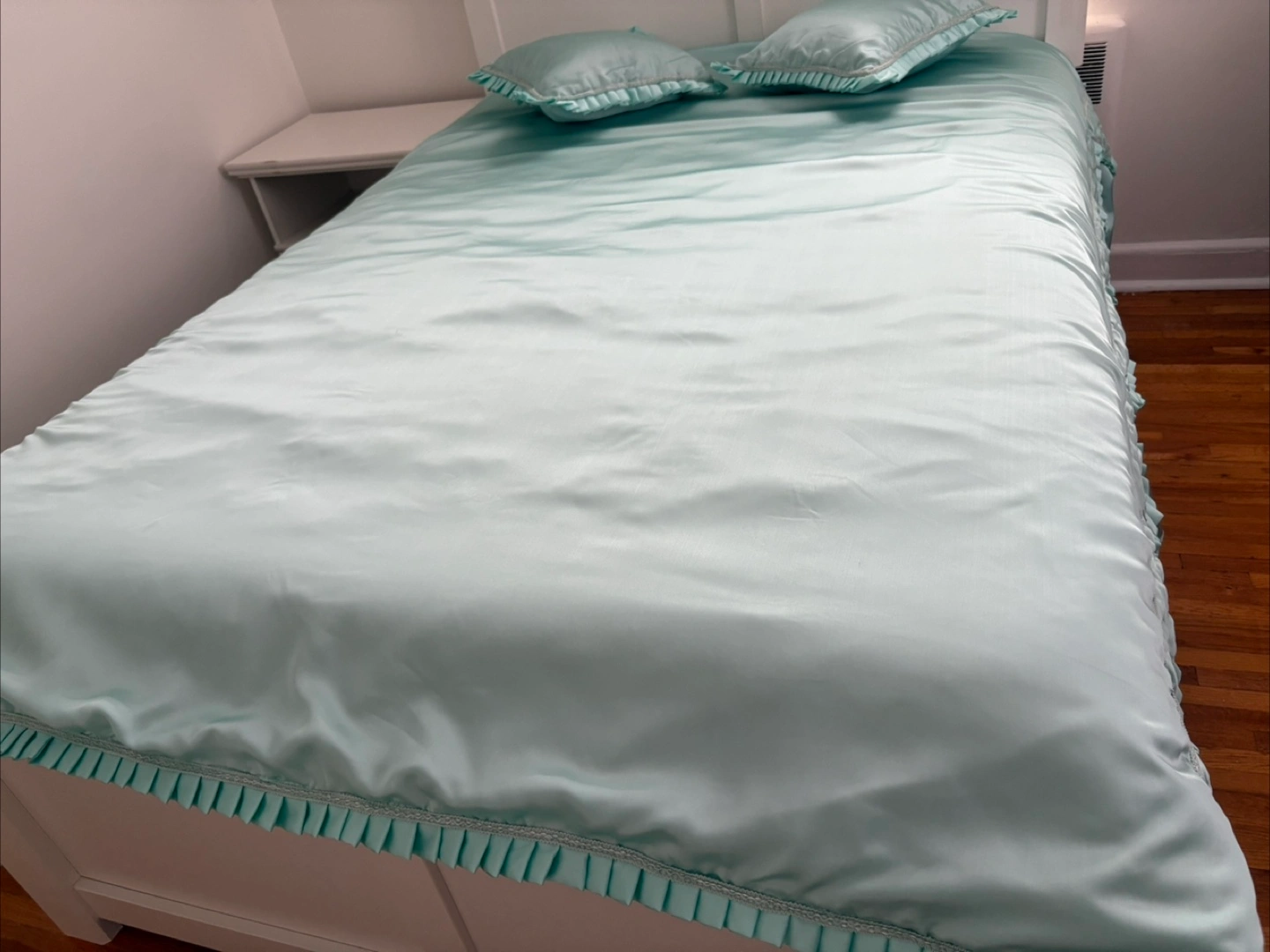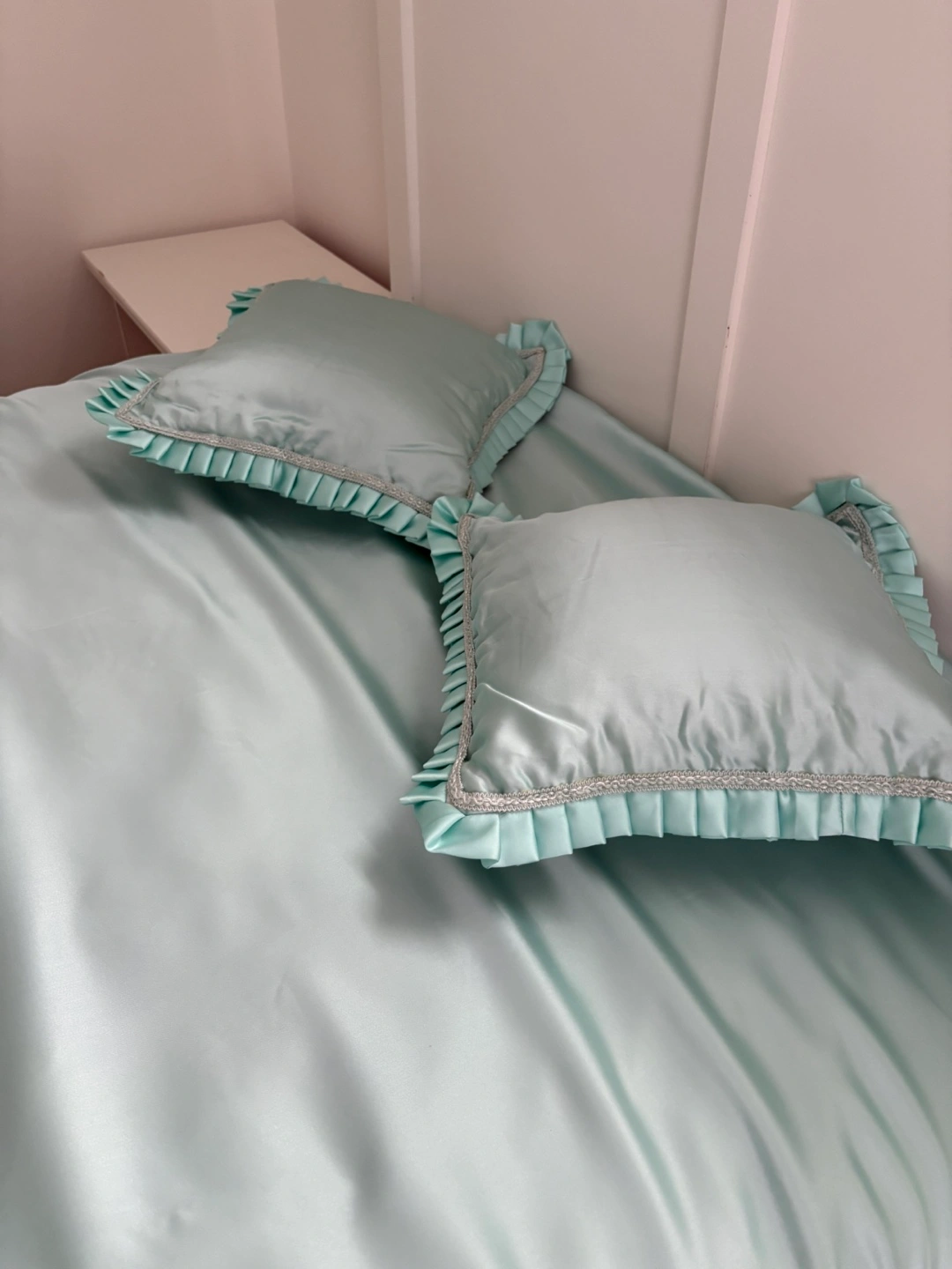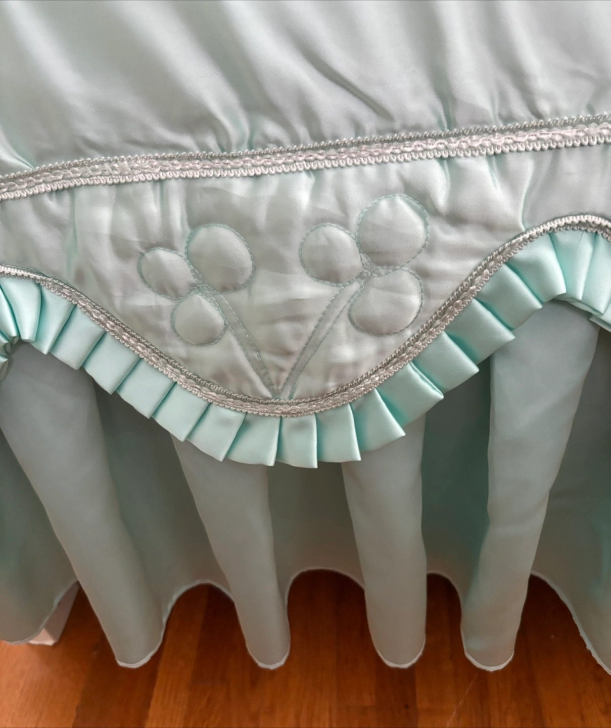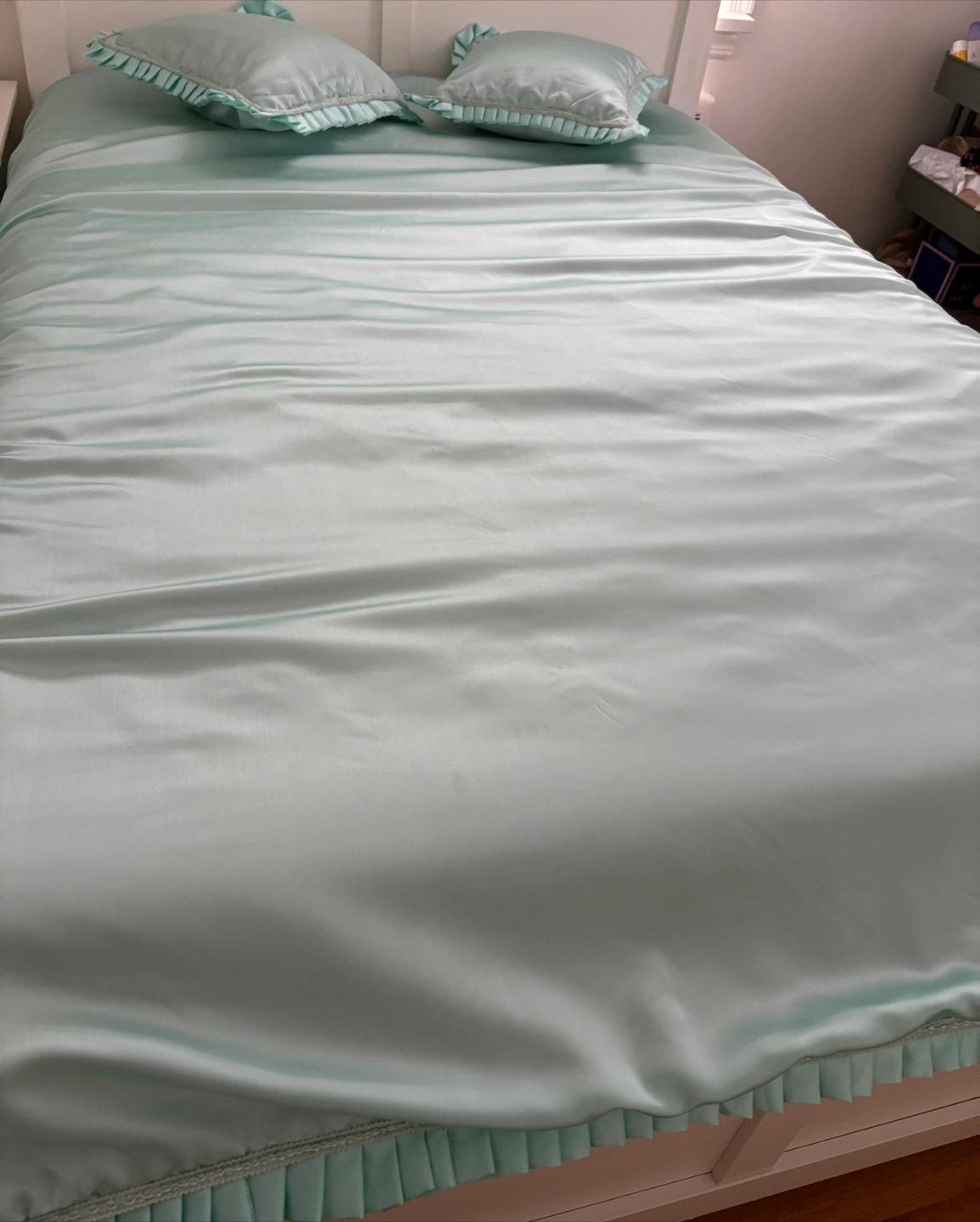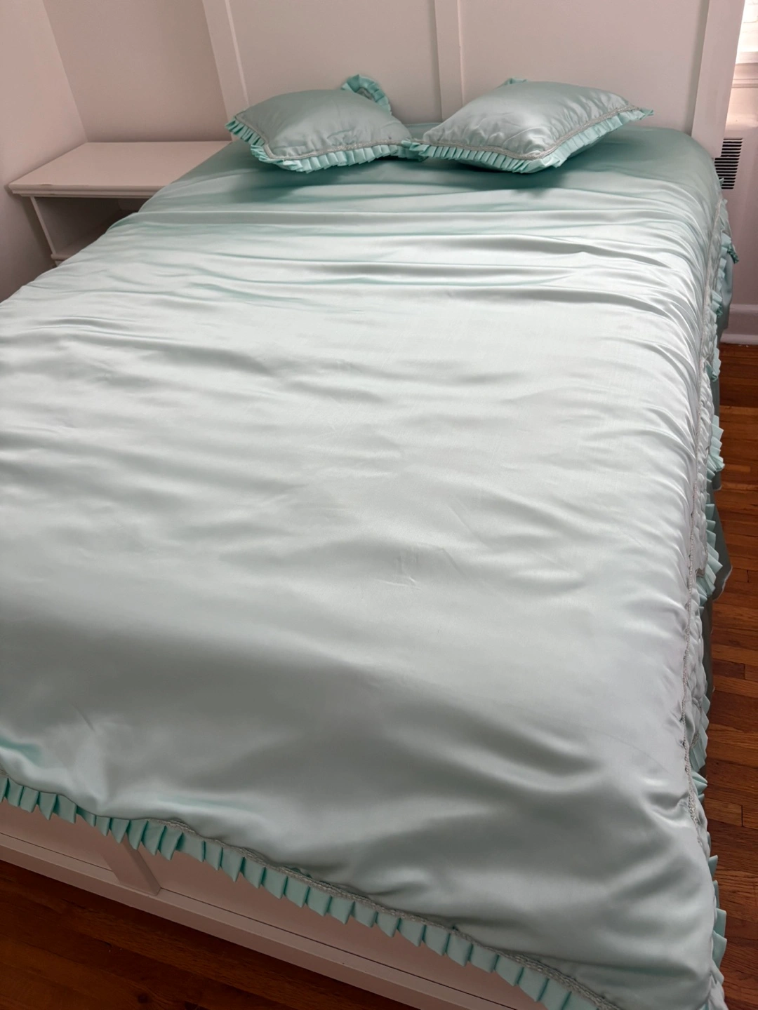 Selling a light Green bedspread with matching pillows! It's in great condition and would look lovely in any bedroom. The bedspread features a decorative ruffled edge and a floral pattern. This set includes the bedspread and two pillow shams. Size: Queen and Full