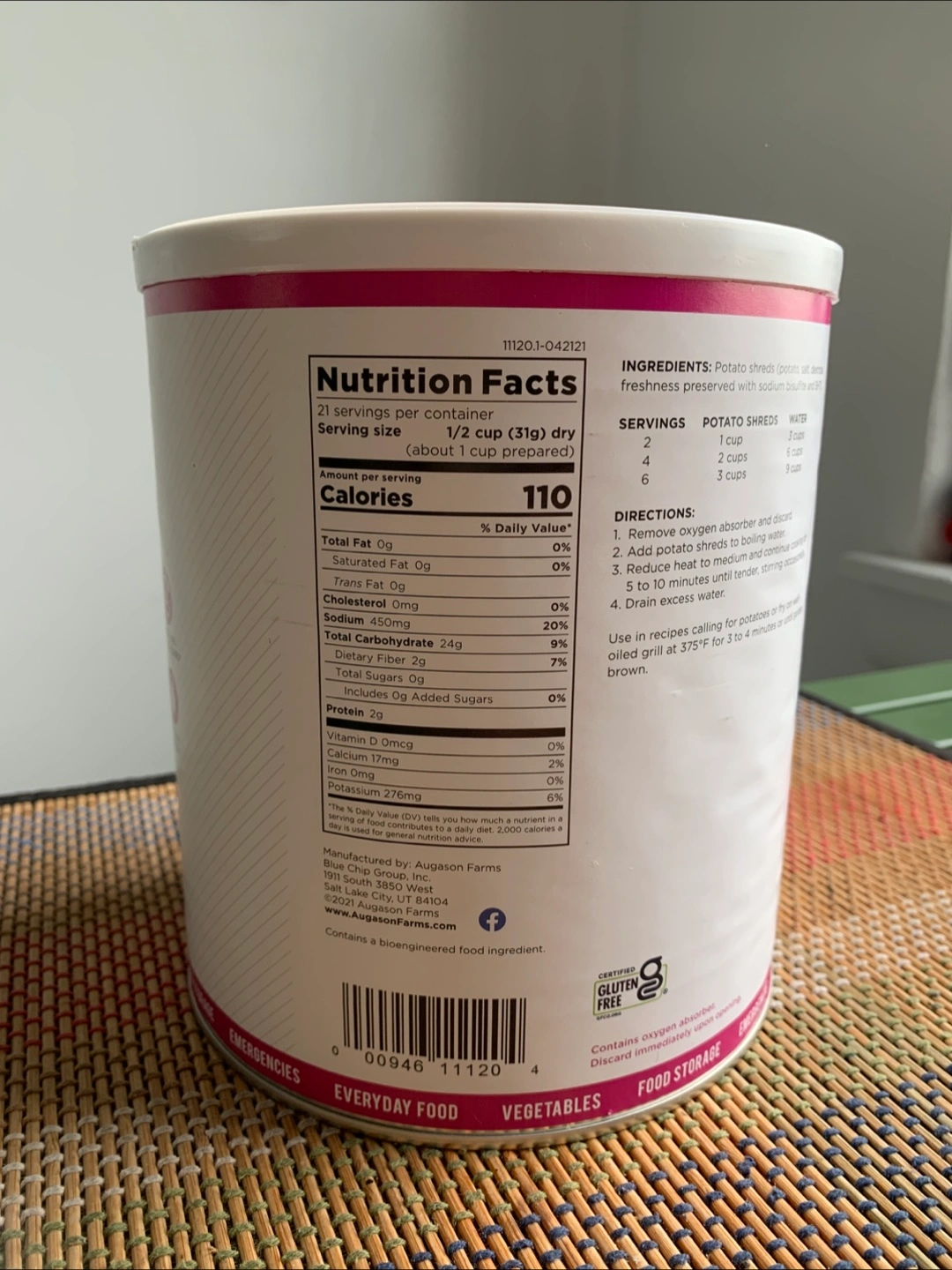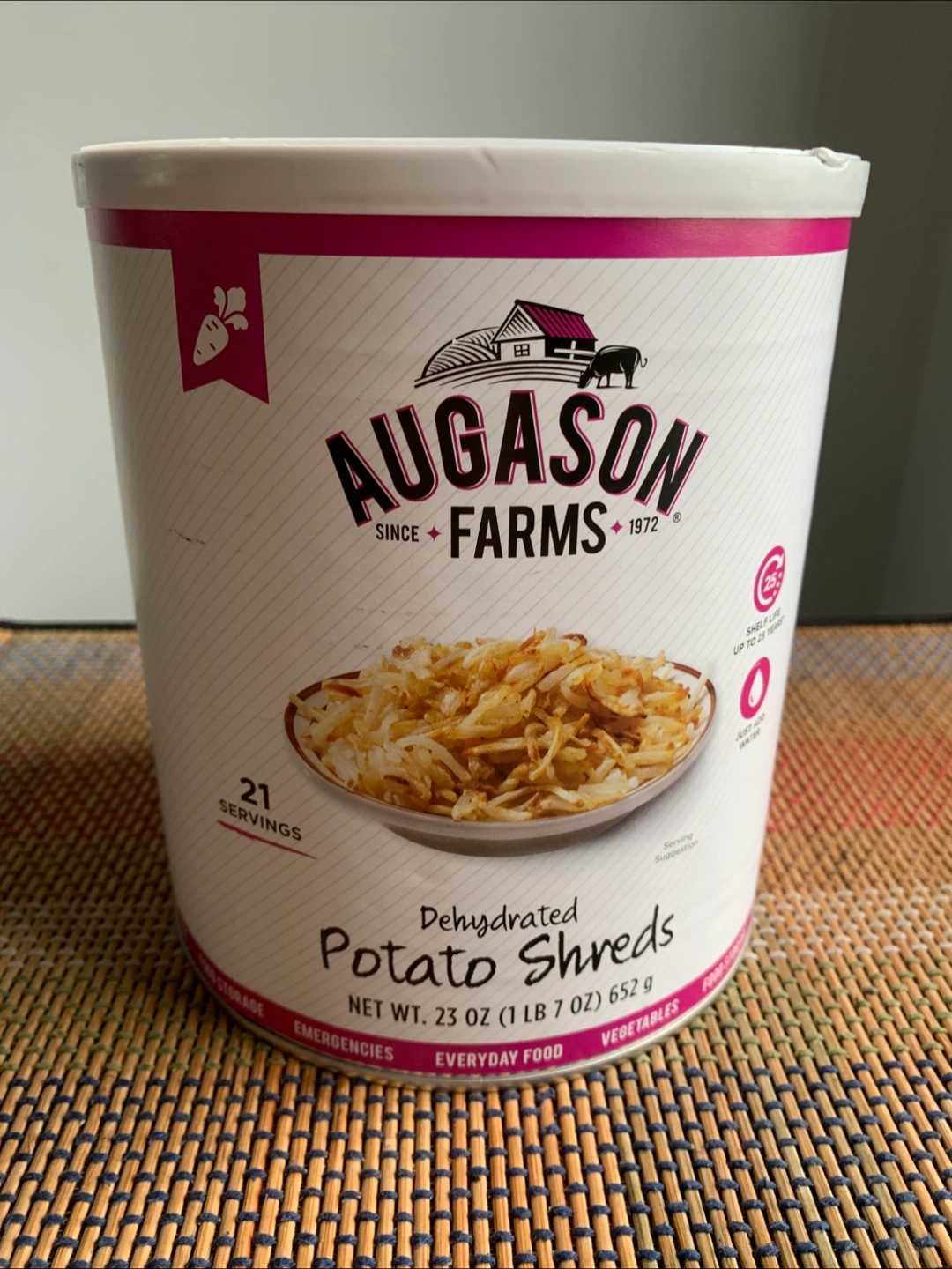 395Giving for free a container of Augason Farms Dehydrated Potato Shreds. It contains 21 servings. The net weight is 23 oz (1 lb 7 oz) 652 g. Great for everyday food, emergencies, and food storage! New unopened. BB 27 feb 49