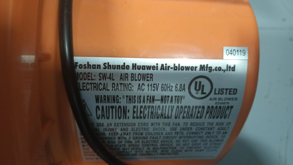 Selling a Foshan Shunde Huawei SW-4L Air Blower. It's an electrically operated product with an AC 115V 60Hz 6.8A electrical rating. Please note the warning: "THIS IS A FAN—NOT A TOY!"
