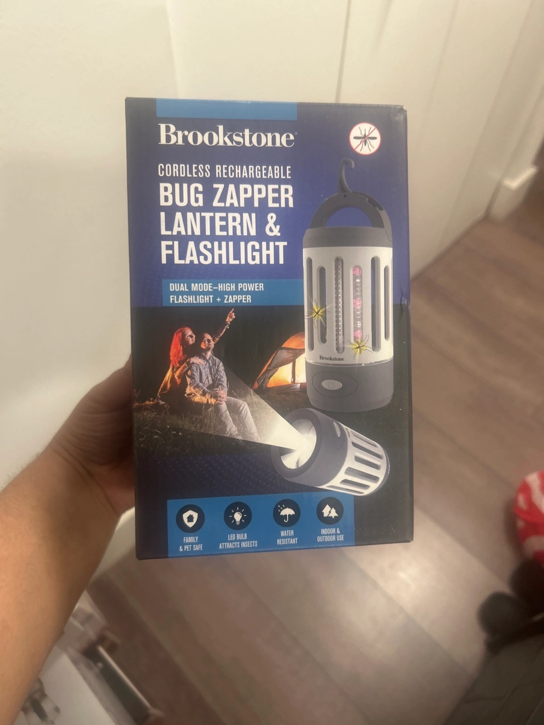 Selling a brand new Brookstone Cordless Rechargeable Bug Zapper Lantern & Flashlight! This handy gadget features a dual mode with high power flashlight and zapper. It's family and pet safe, uses an LED bulb to attract insects, and is water resistant for indoor and outdoor use. Comes in the original box!