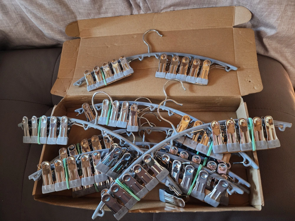 747Giving away a bunch of clothes hangers with clips! They're great for hanging pants, skirts, and other items. Comes with a box. Great space saver for your clothes.