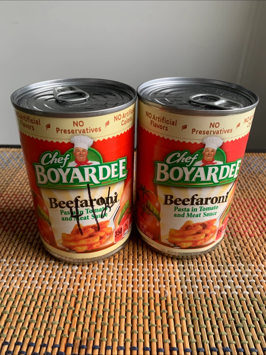 395Giving away two cans of Chef Boyardee Beefaroni. Enjoy a quick and easy meal with pasta in tomato and meat sauce. Expiration dates: - One can expires January 13, 2026 - The other can expires April 05, 2026