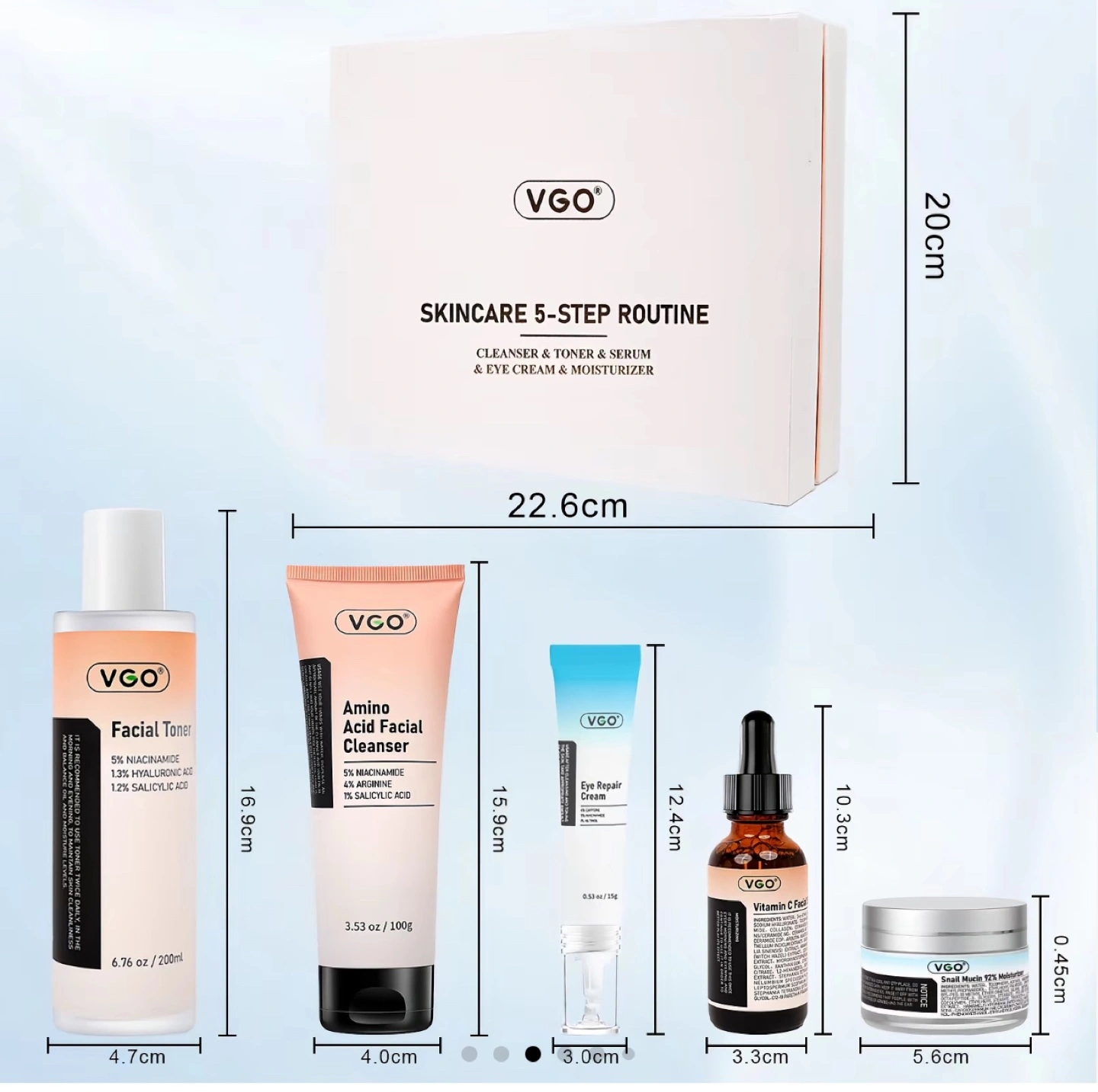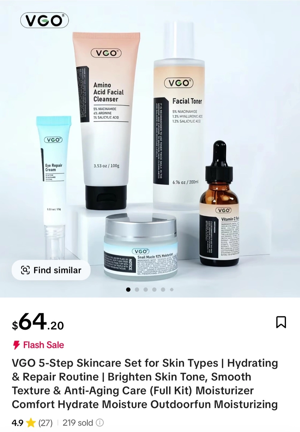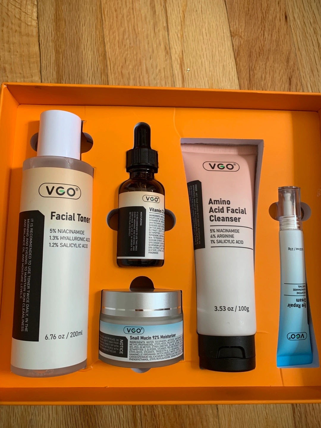 I'm selling a brand new VGO Skincare 5-Step Routine Set! This set includes a cleanser, toner, serum, eye cream, and moisturizer, all designed to hydrate and brighten your skin. The set includes: - Facial Toner (6.76 oz / 200ml) with 5% Niacinamide, 1.3% Hyaluronic Acid, and 1.2% Salicylic Acid - Amino Acid Facial Cleanser (3.53 oz / 100g) with 5% Niacinamide, 4% Arginine, and 1% Salicylic Acid - Eye Repair Cream (0.53 oz / 15g) - Vitamin C Facial Serum - Snail Mucin 92% Moisturizer Originally bought for $64.20, this set is perfect for anyone looking to improve their skin's texture and overall appearance