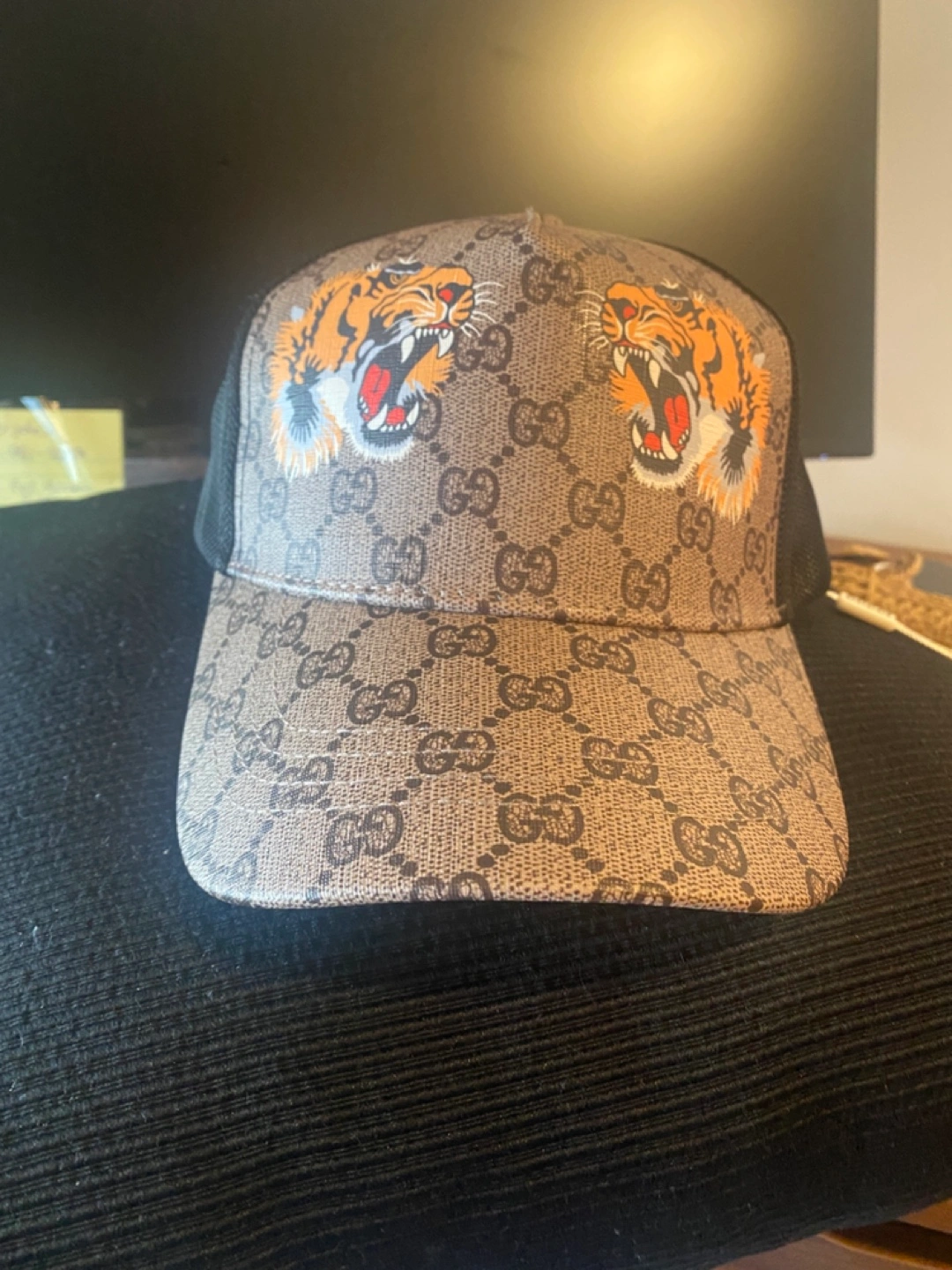 70Selling a Gucci baseball cap with a tiger print! It features the iconic Gucci logo pattern and a cool tiger design on the front. The back has the classic Gucci stripe detail. Replica Brand new See my other items for sale Text 347-366-4713
