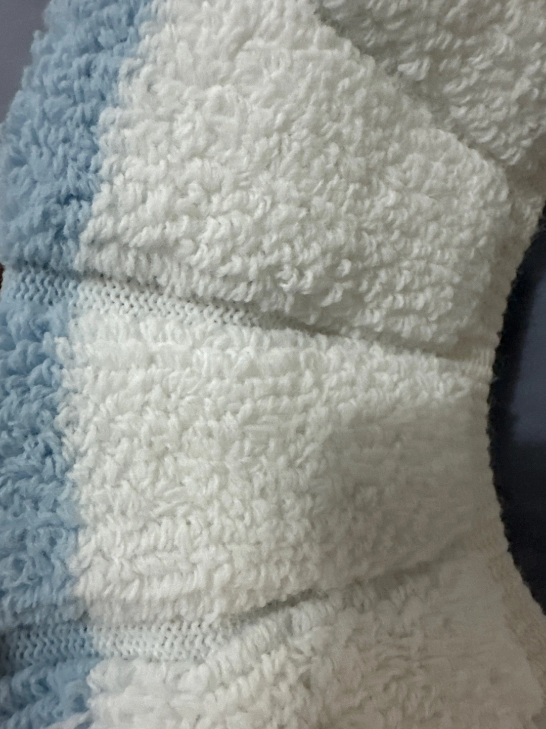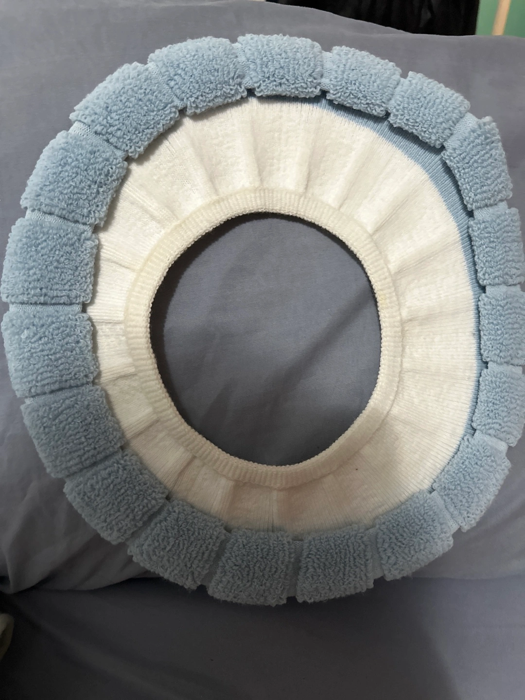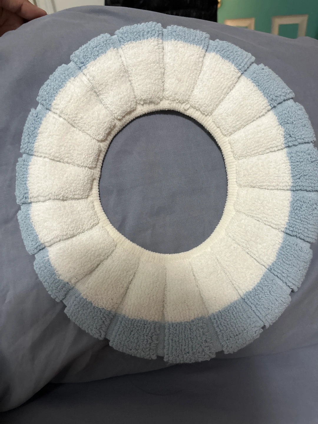 Here's a soft and cozy toilet seat cover in a pleasant blue and white color scheme. ready to add a touch of comfort to your bathroom!
