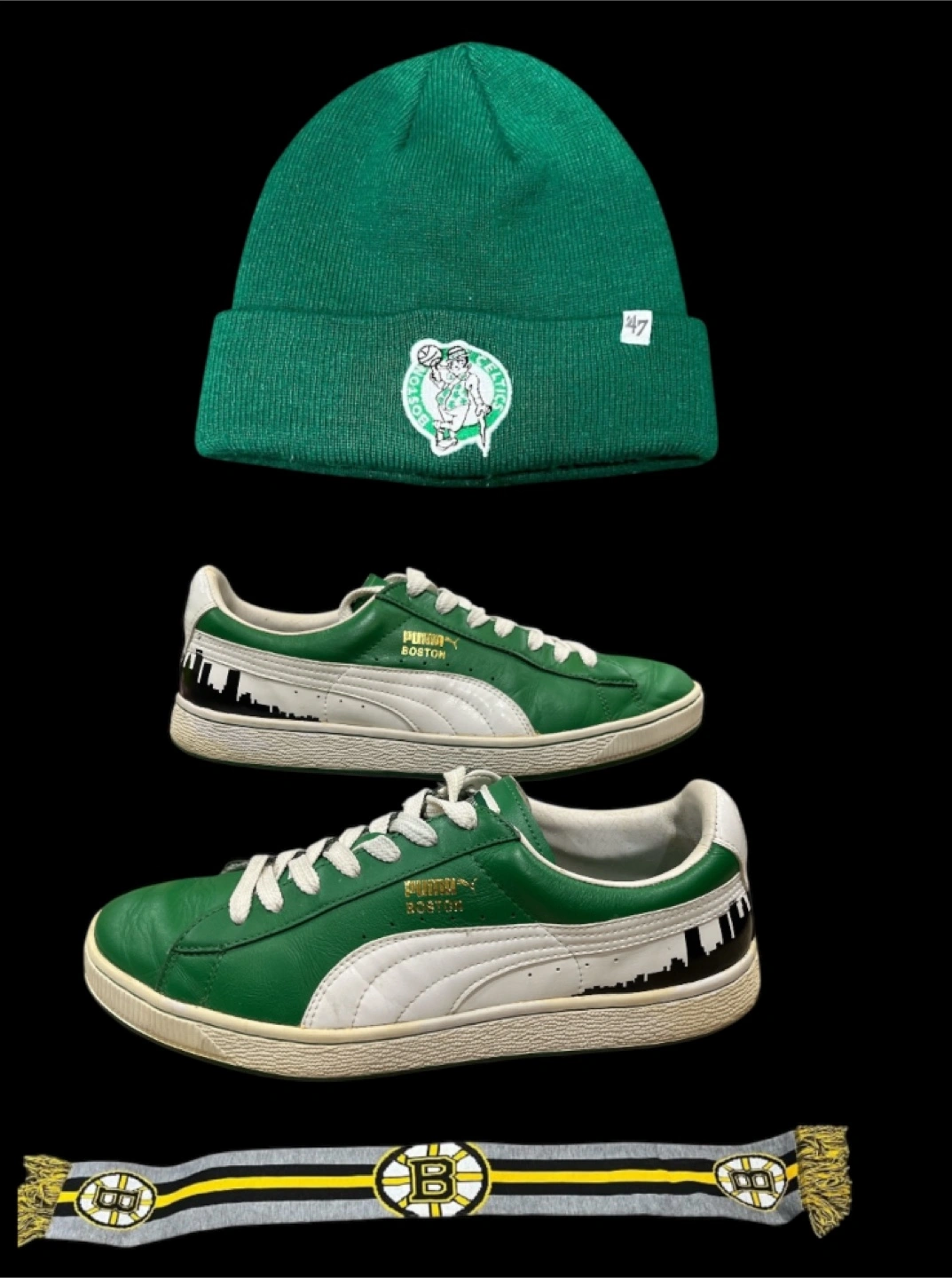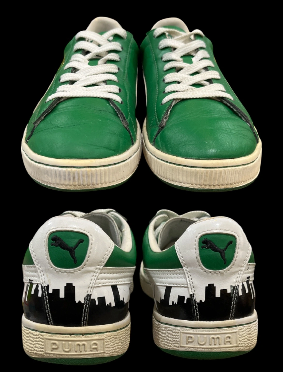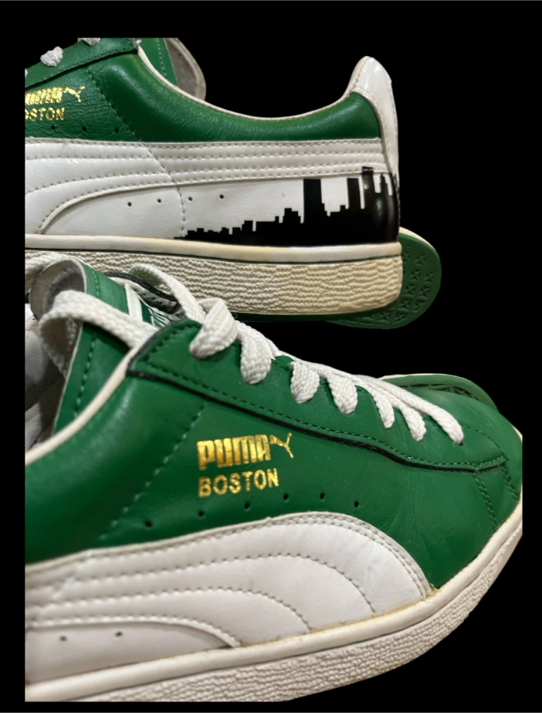 Selling a pair of Puma vintage sneakers in green and white, featuring Boston Celtics details! These shoes have a unique design with a skyline accent and Boston celtic’s beanie and Boston hockey team They are in good condition and ready for a new home