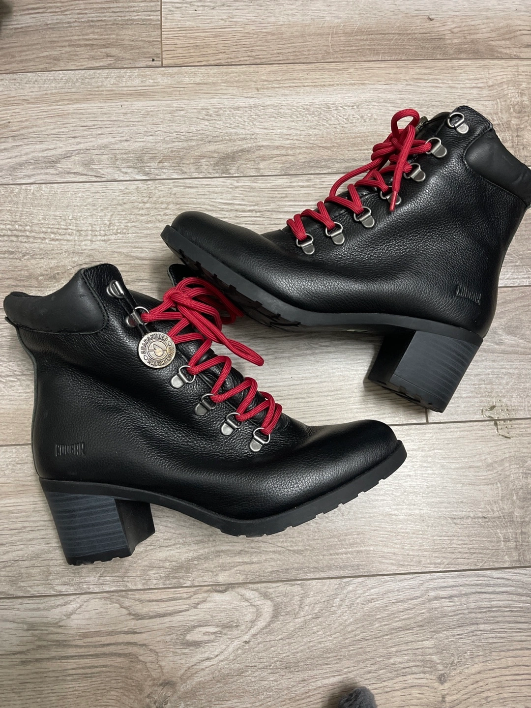 96These are a pair of Cougar black leather heeled boots with red laces. They are in good condition and ready for a new home!